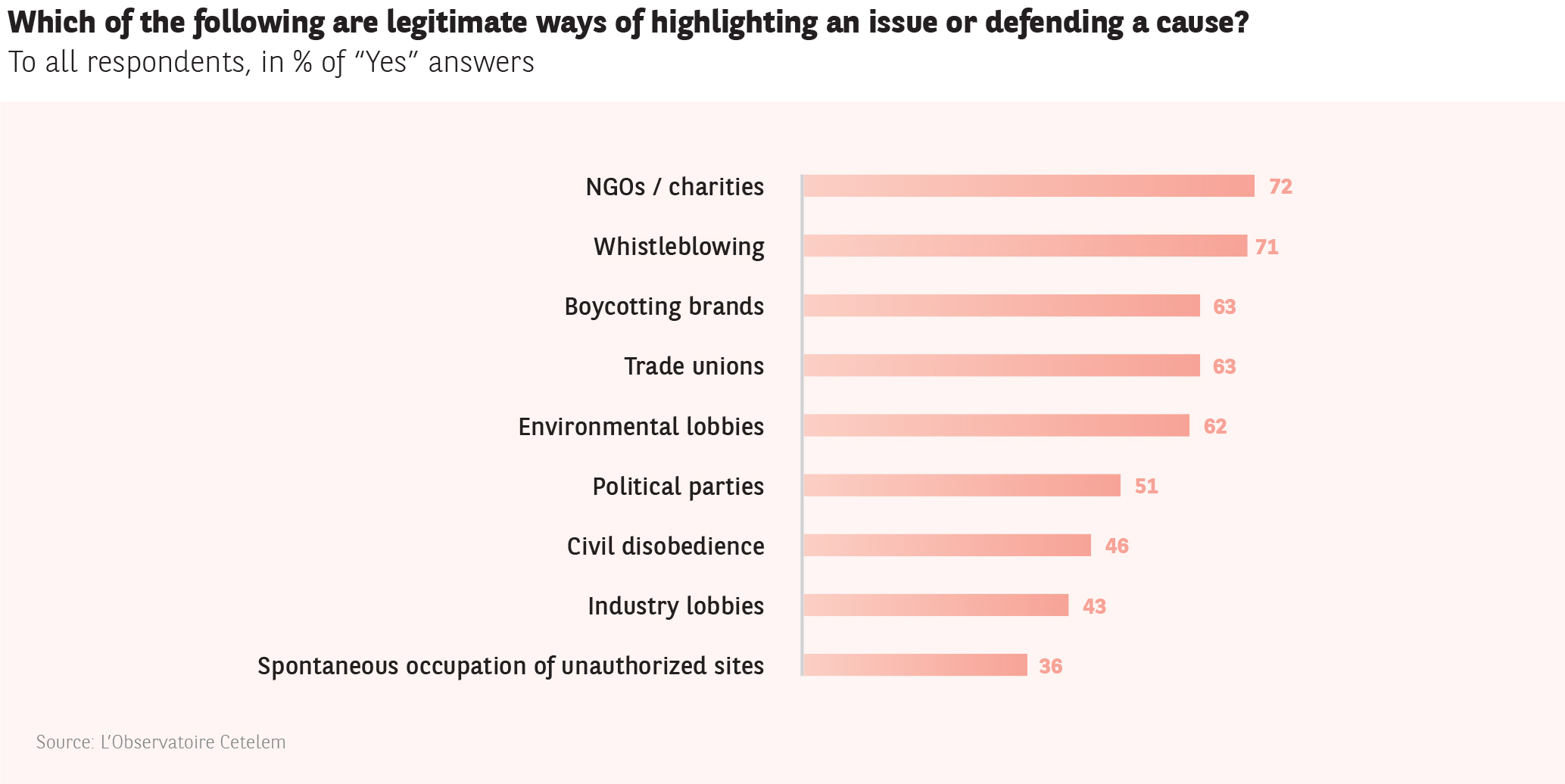 The fact that Europeans believe it is justifiable to take action in support of a cause is a telling sign that activism is on the rise. Boycotting a brand is their preferred option (63%), although this is slightly less common among millennials, who are only now gaining awareness of consumerism and are therefore less likely to make this sacrifice. Almost 1 in 2 Europeans support civil disobedience. More than a third consider the spontaneous occupation of unauthorized sites to be a legitimate tool.