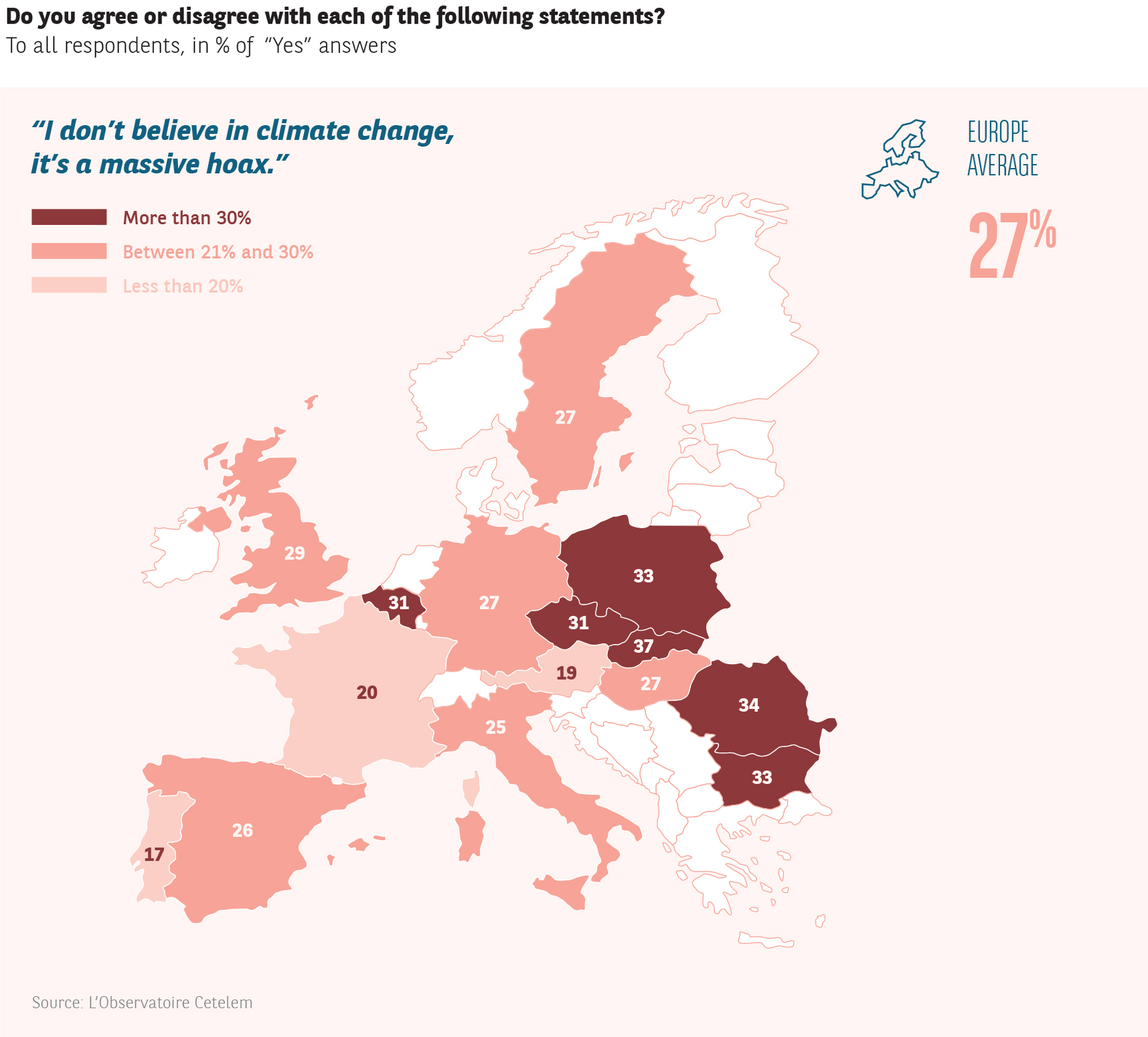 Eastern Europe also stands out from the rest of the continent due to the high proportion of its inhabitants who declare themselves to be climate sceptics (Fig. 13).