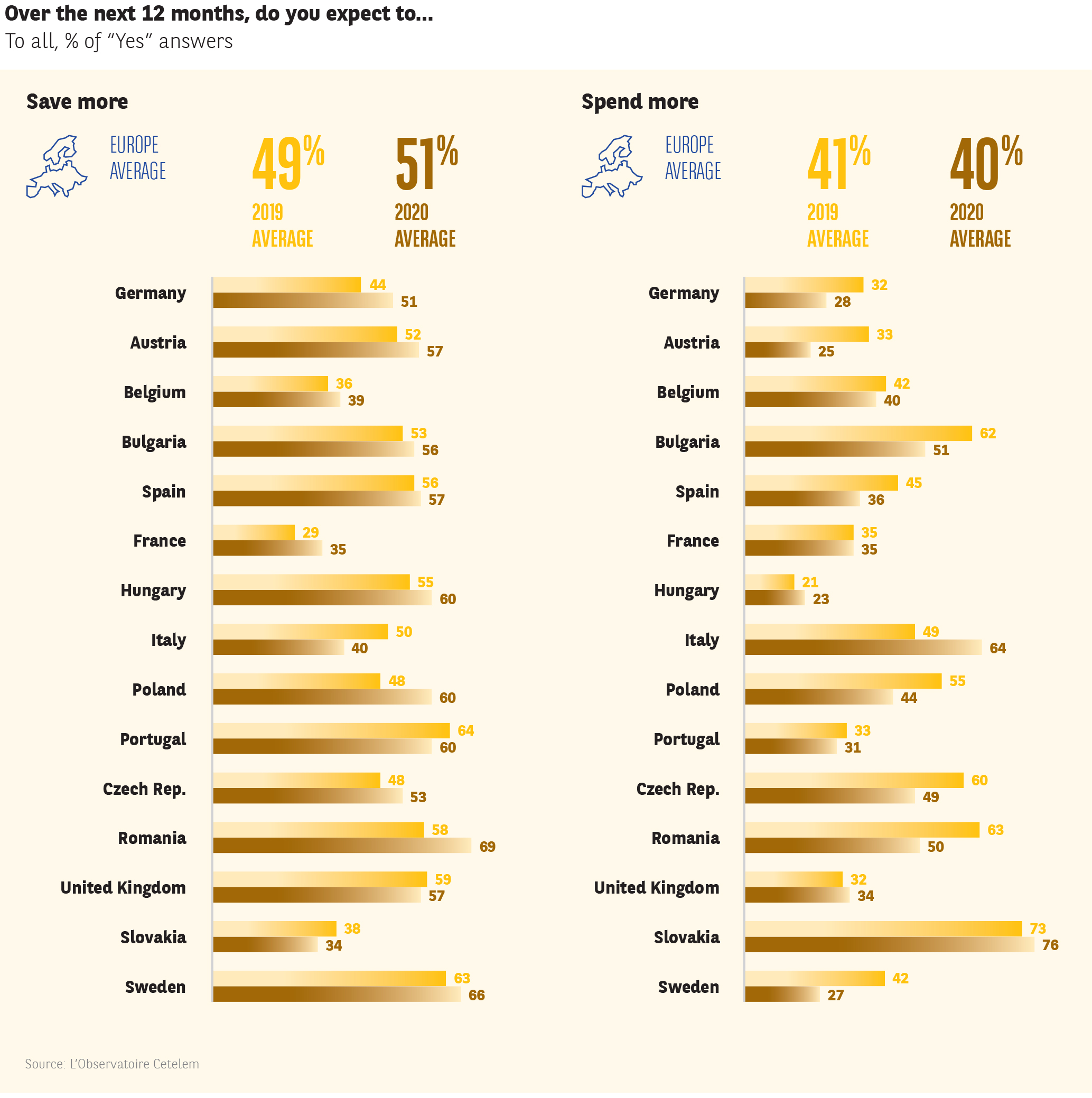 When it comes to the intention to spend more, more or less the same 11 countries appear more prudent. Slovakia aside, all the Eastern European countries are pulling the handbrake on spending, as are Spain and, more strikingly, Sweden (-15 points). Once again, Italy stands out from the rest of Europe by displaying a very strong desire to spend (+15 points).