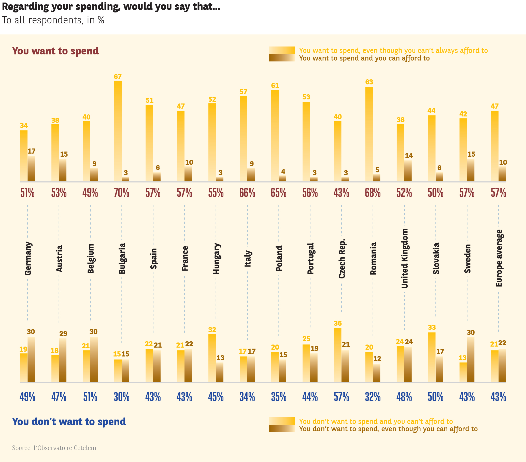 The majority of Europeans say they are keen to consume (57%), but admit that they cannot always afford to (21%) (Fig. 4). Once again, it is mainly in the Eastern European countries that this financial frustration is most strongly felt. Conversely, Austria, Germany and Sweden exhibit a high capacity to consume. Meanwhile, France falls squarely within the European average.