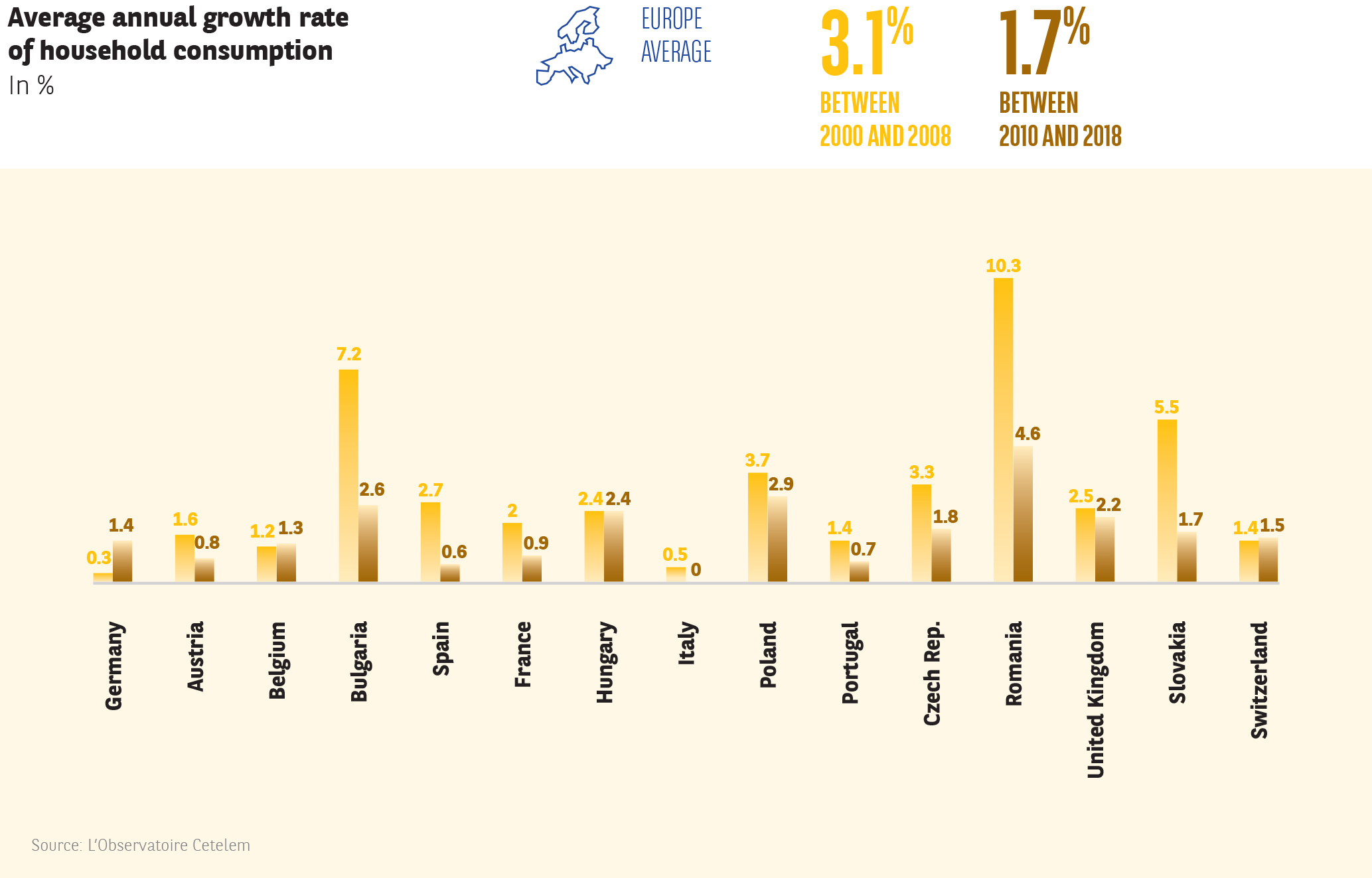 The last 20 years have been marked by continuous growth in household consumption, particularly in Eastern European countries, but there was a sudden slowdown after the 2008 financial crisis (Fig. 5).