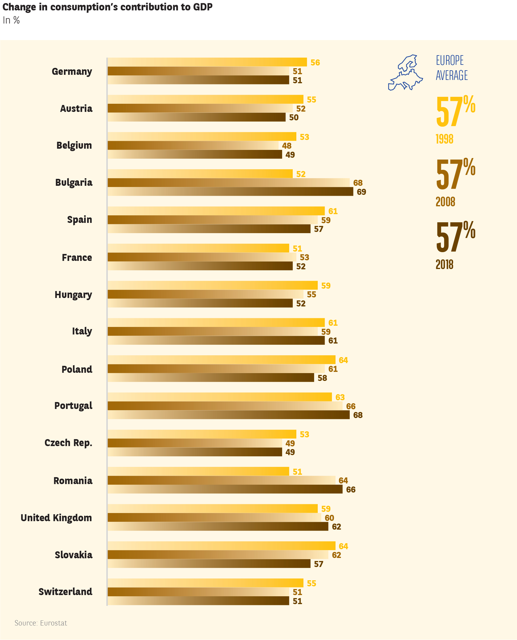 In all countries, and for some time now, consumption has accounted for the bulk of national GDPs and its growth has been the main driver of economic prosperity (Fig. 6).