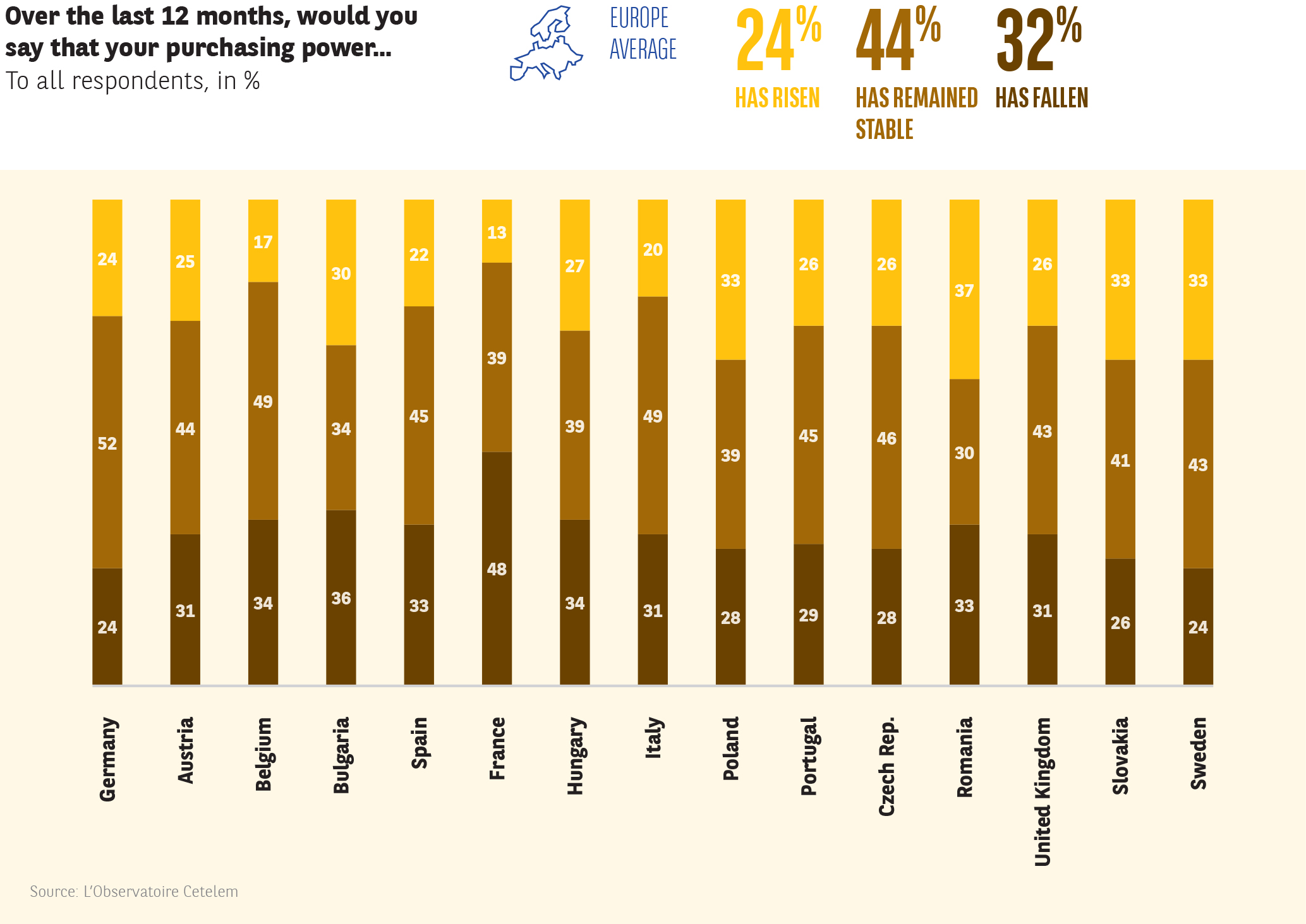 Naturally, this feeling of not being able to afford to consume reflects an overall level of purchasing power that appears stagnant (Fig. 7). Indeed, 44% of Europeans believe nothing has changed in this regard. in 9 out of the 15 countries, the proportion of respondents who state that their purchasing power has increased is up from last year. the most significant upward trends can be observed in Poland, France, Italy and the United Kingdom. It should also be noted that seniors are significantly more likely than average to feel that their purchasing power is declining.
