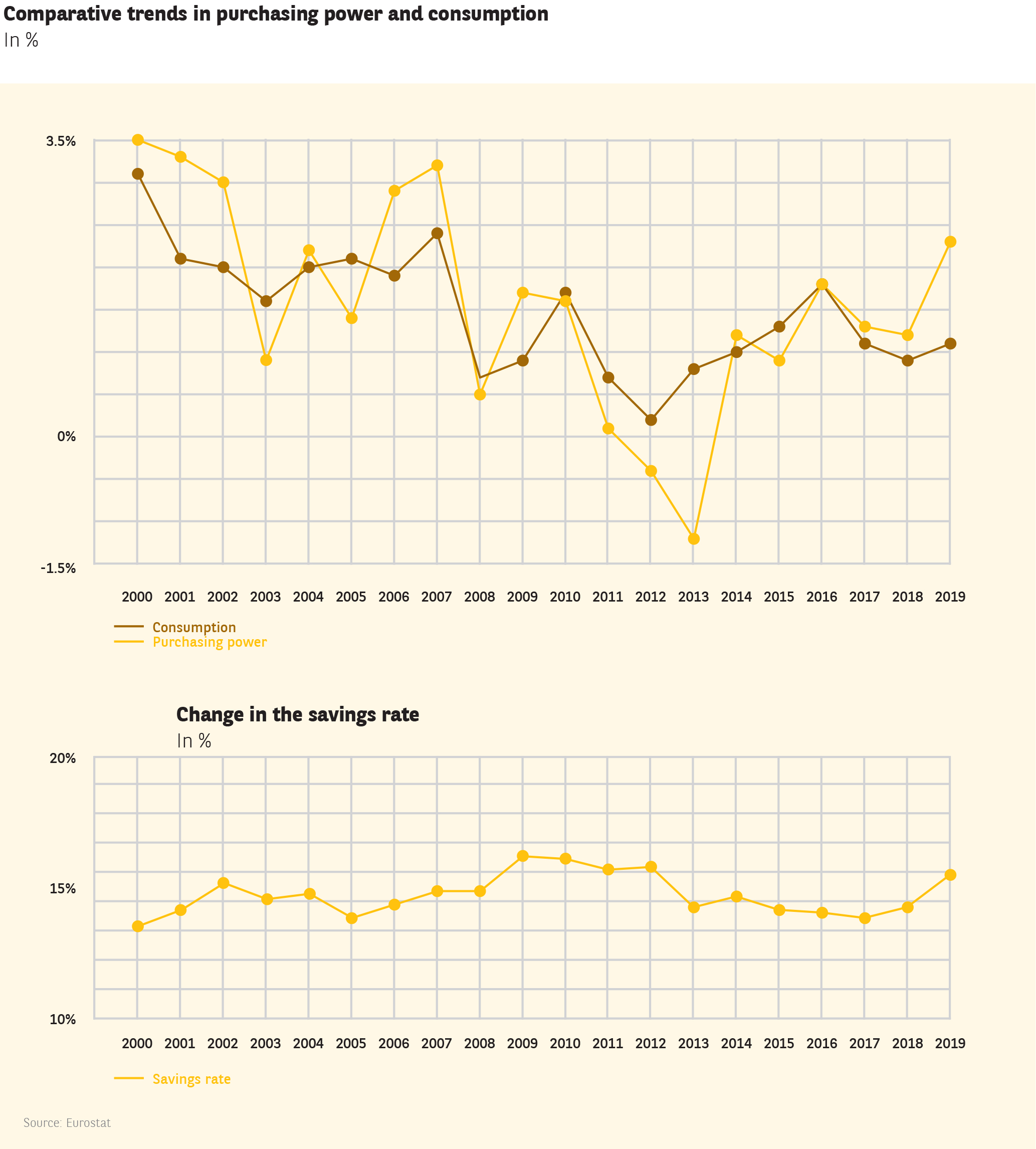 In France, purchasing power increased faster in 2019 than in any year since 2007. Yet, this was not enough to boost consumption. Conversely, in spite of low interest rates, savings are on the rise. This is evidence that feelings matter as much, if not more, than actual economic data (Fig. 8).