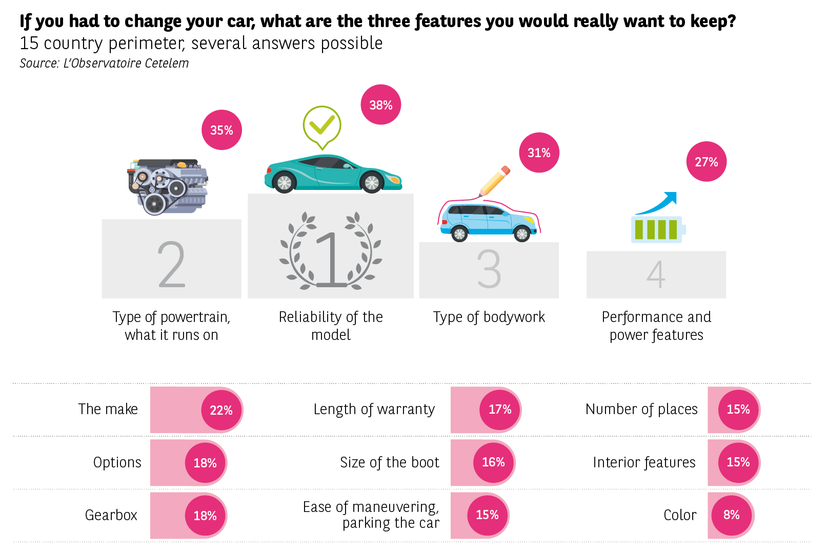 Change is happening in a kind of continuity. When it is time to change cars, customers base their choices on certain values in this world of frenzied choice. Reliability (38%), type of powertrain (35%) and outline (31%) are the triptych of these values sought by the motorists interviewed. It’s worth pointing out that the Italians, Portuguese, Turks, Mexicans, and French are the most attached to the powertrain.