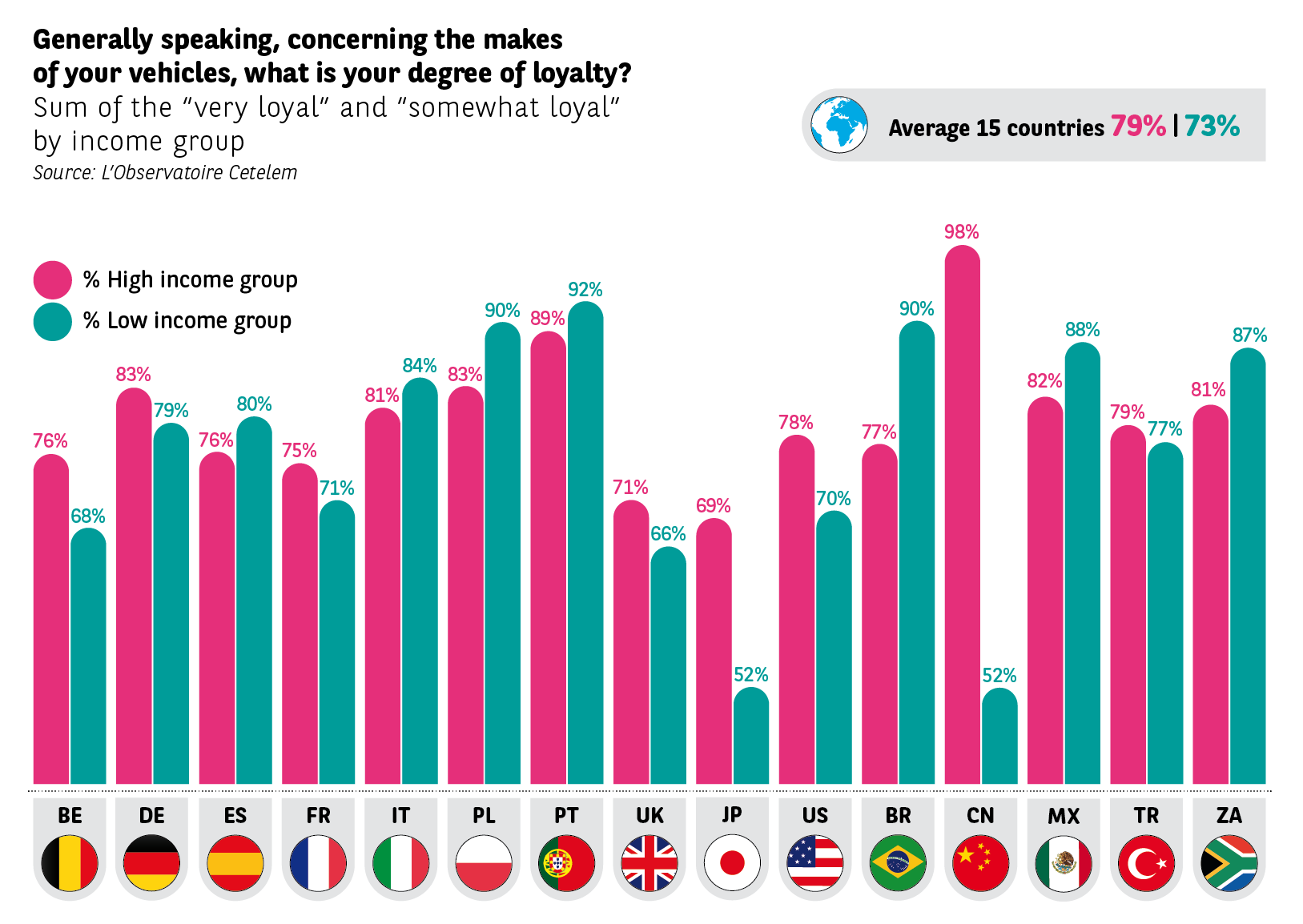 Geographically speaking, we find them in low-income countries, or in countries that have been through deep financial crises: Mexico, Brazil, South Africa, Italy, Spain, and Portugal. In these countries, people with the lowest incomes say that they are more loyal to makes of car. This is astonishing since these customers tend to frequent the second-hand market, which creates significantly less loyalty.