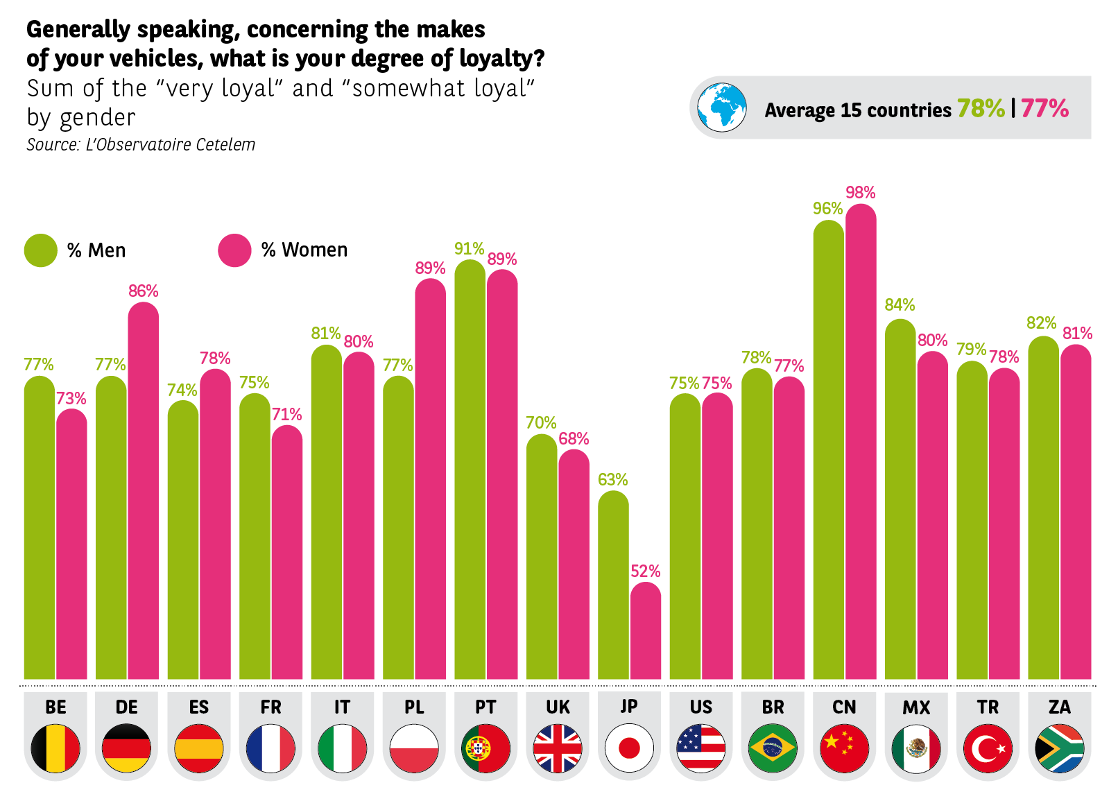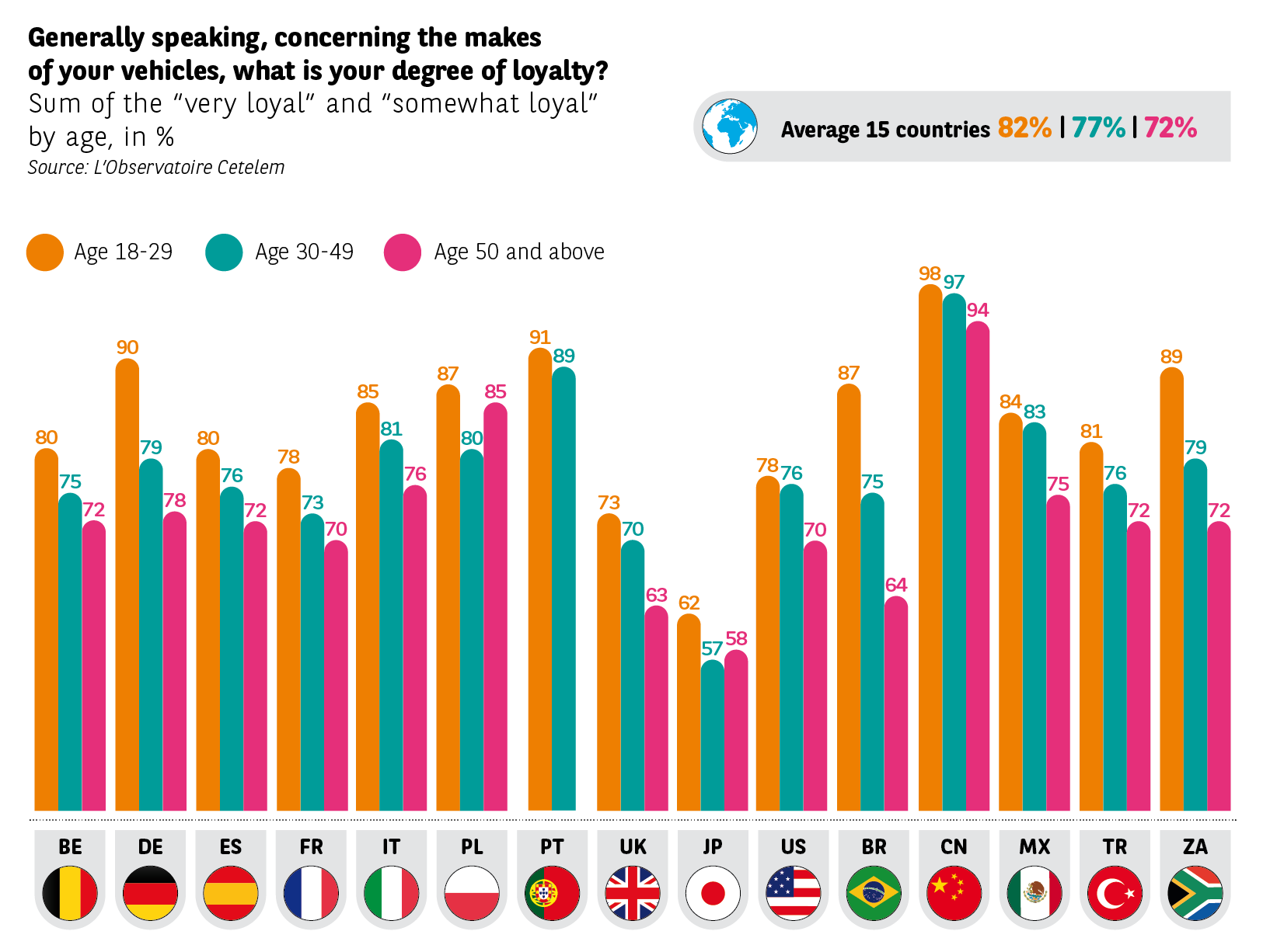 Chinese and Japanese households are much more loyal the higher their income (China: 98% vs. 52%; Japan 69% vs. 52%). This behaviour, in these two leading automobile manufacturing countries, can be explained by a clear preponderance for the new car market, notoriously more loyalty-oriented.