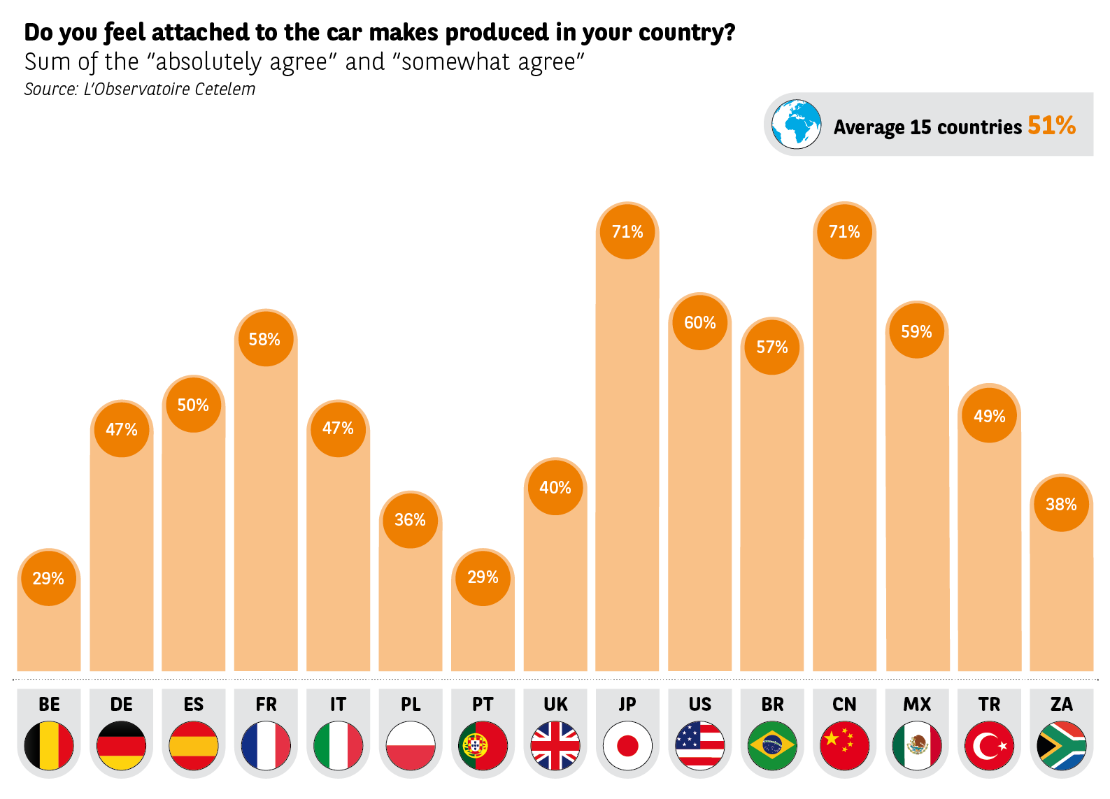 Localism is a long outdated concept, the entire planet now being the playing field for international car manufacturers. Despite the excesses of globalisation, 1 out of 2 motorists state that they are not particularly attached either to car makes from their own country, nor to the principle of local manufacture. In Belgium and in Portugal, where there are no local makes and few assembly lines, only and logically 29% feel concerned about this issue. Respondents in Japan, China, USA and France, automotive strongholds where temptations and protectionist messages are abundant, are the most concerned about the future of their factories (respectively 71%, 71%, 60% and 58%). Surprisingly, other historically high seats of the automotive industry, like Germany, Italy, United Kingdom and Spain, seem less concerned about their makes and local factories. Brexit or no Brexit, the British are a mere 40% concerned about local production.