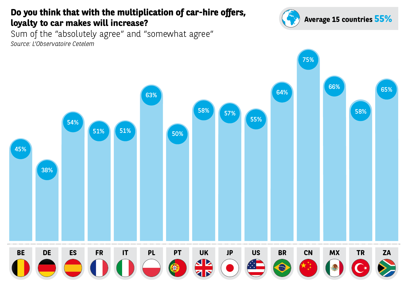 If you believe what respondents say, full entry of the automobile into the service era should not profoundly affect loyalty. Although leasing and long or medium-term car hire offers with or without a purchase obligation, something Anglo-Saxons have been doing for a long time now, is encountering increasing success, people don’t think it will necessarily have a radical impact on motorists’ loyalty. Indeed, 55% think these offers will increase loyalty, and the Chinese and Polish are still the most affirmative on this score (75% et 63 %).