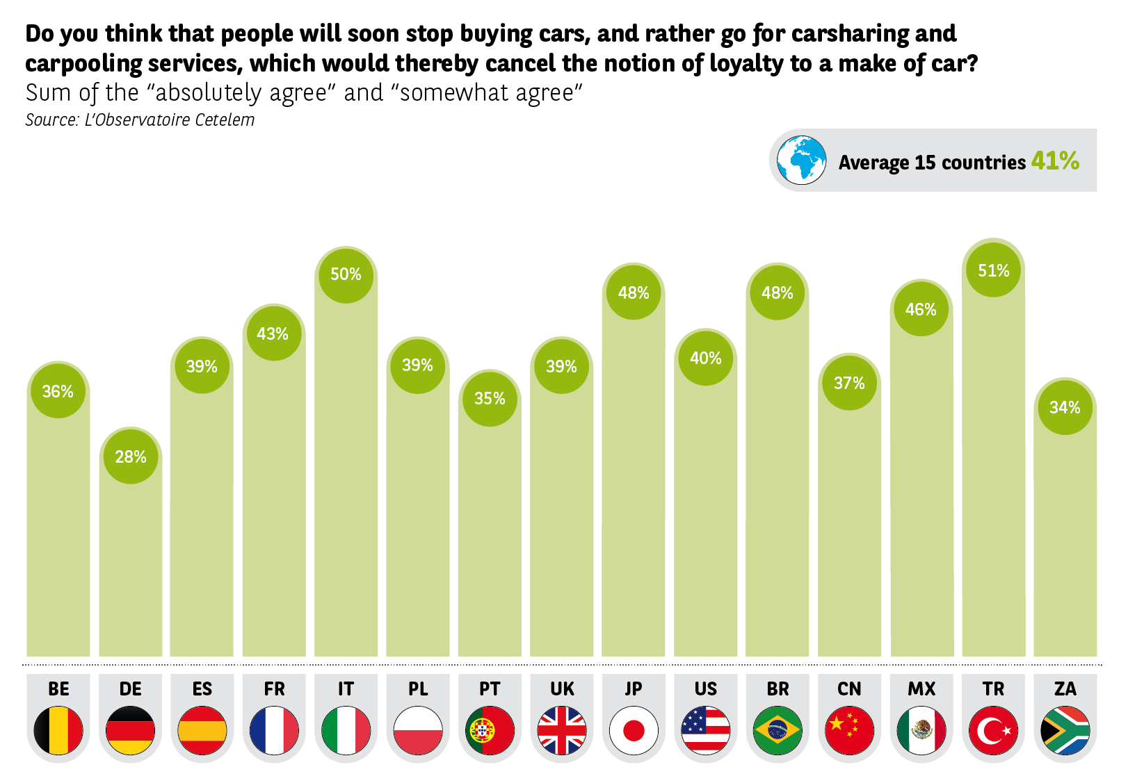More globally, motorists no longer believe that the generalization of services, like one-off car hire, carsharing or carpooling, will cause disloyalty. Only 4 out of 10 consider that it will incite people to be less loyal. Only Turkey shows a slight majority in this sense (51%). It is in Germany that people consider that nothing will change (28%), France classing itself in the average (43%).