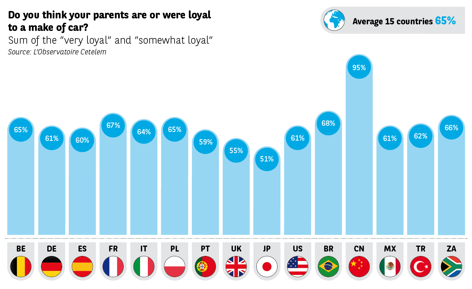 In those days, constancy was the rule, inconstancy the exception. Respondents to L’Observatoire Cetelem de l’Automobile 2018 seem to remember this. Two thirds of them said that their parents were loyal to a make of car. 95% of Chinese state this, too. But did they have a choice of car makes until now? On the other hand, only 55% and 51% of British and Japanese people remember their parents’ loyalty.