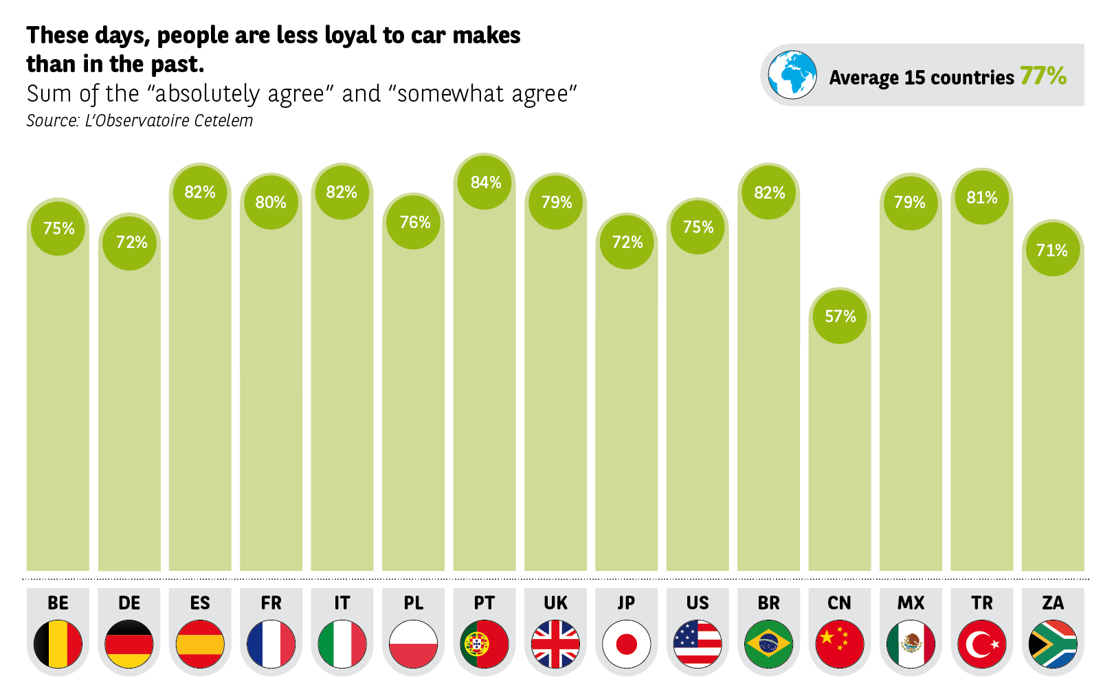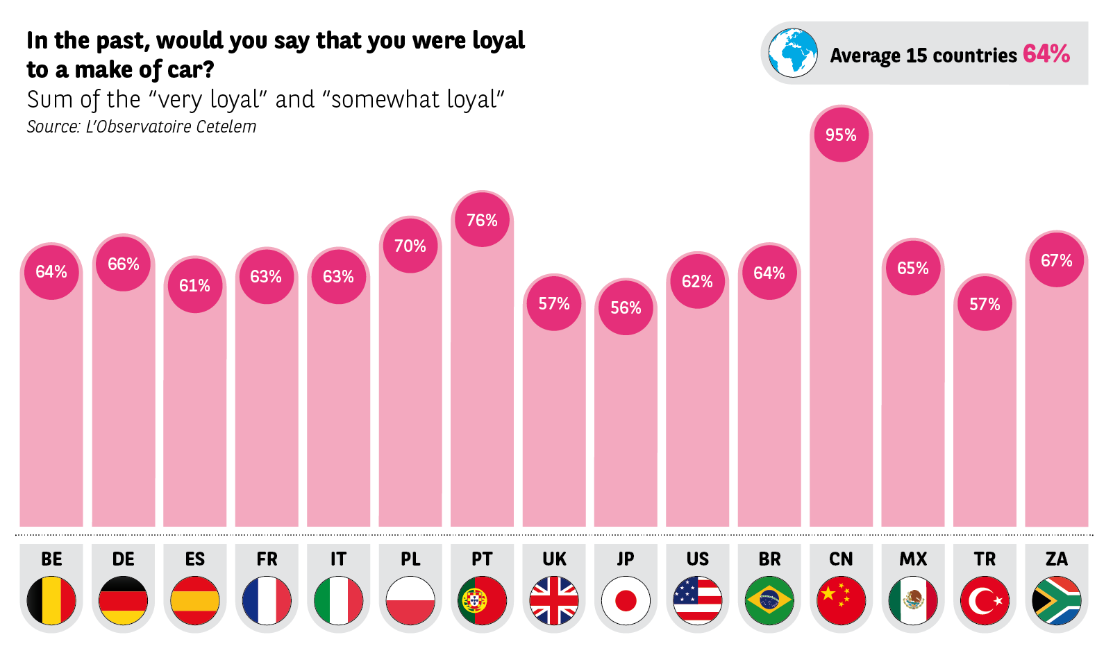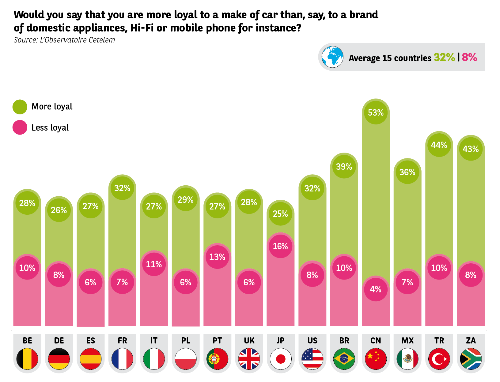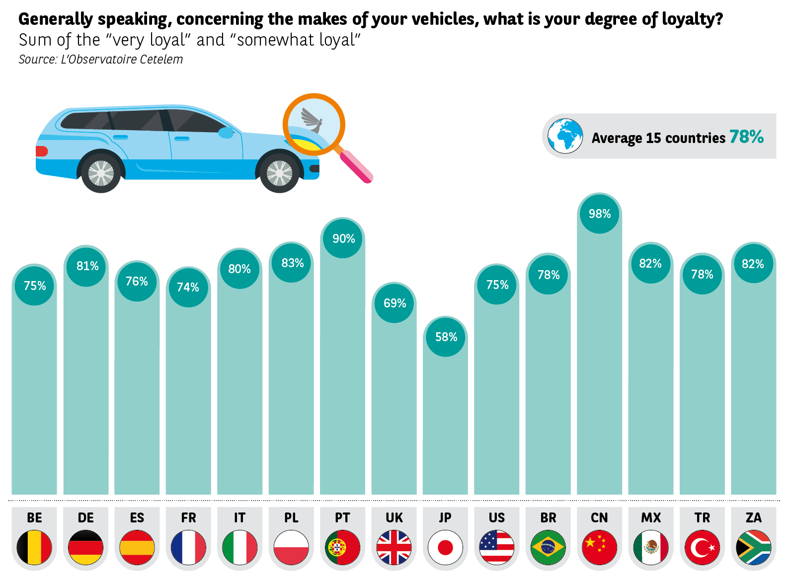 On the other hand, when we ask motorists if they themselves are loyal to car makes, 78% state, loud and clear, that they are. The Chinese and Portuguese come top at 98% and 90% loyalty. 5 other countries are attached to their make by more than 80%. The British and Japanese almost seem unstable with “a mere” 69% and 58% of declared loyalty.
