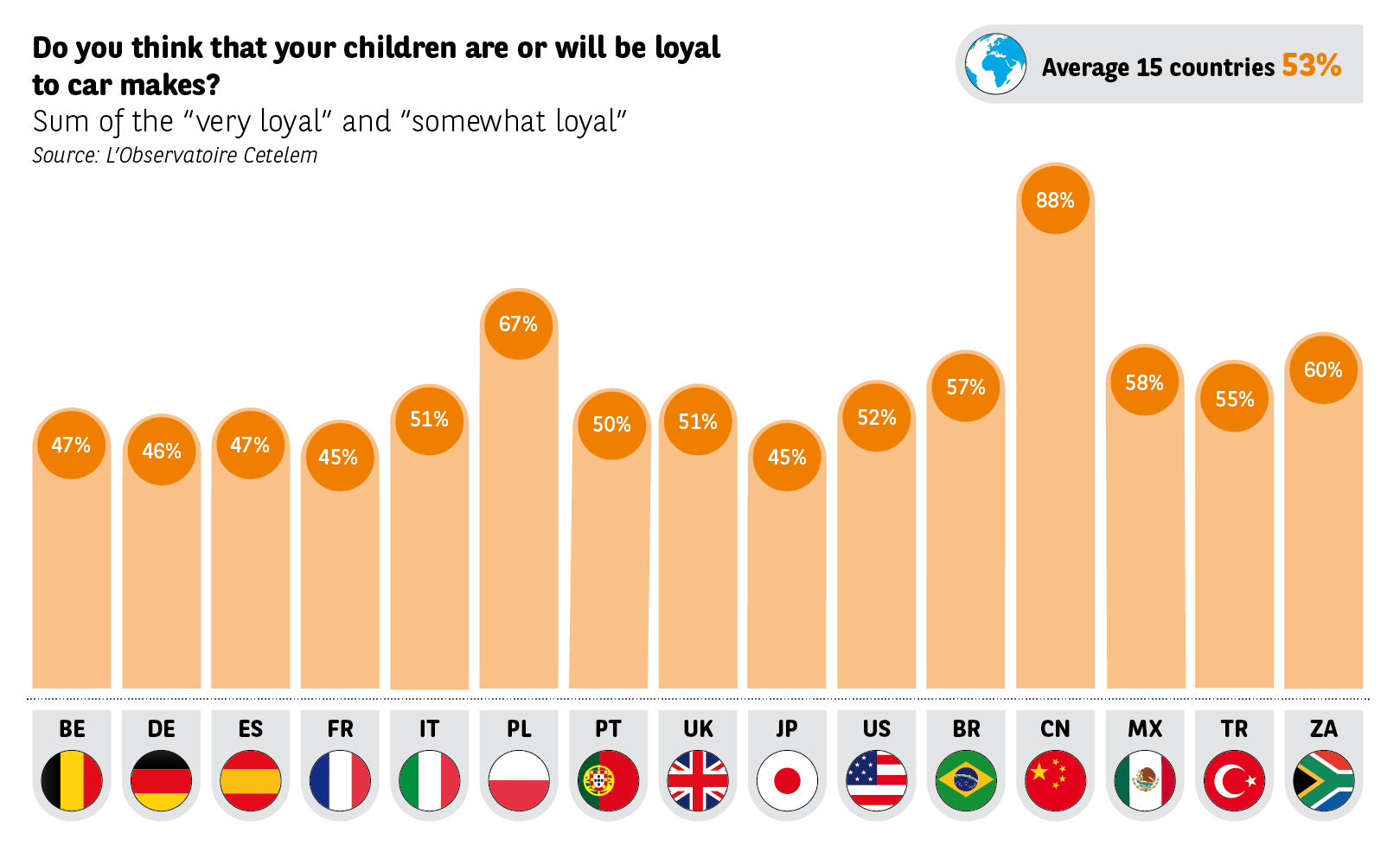 The future also seems less prone to constancy. When they envisage their children’s loyalty to makes of cars, only 53% of motorists see them as being loyal. All the western countries foresee that their descendants will approach or come under the threshold of 50% loyalty to the same make. Only the Chinese once again, and the Polish to a lesser degree, predict more stability among future generations (88% and 67%).