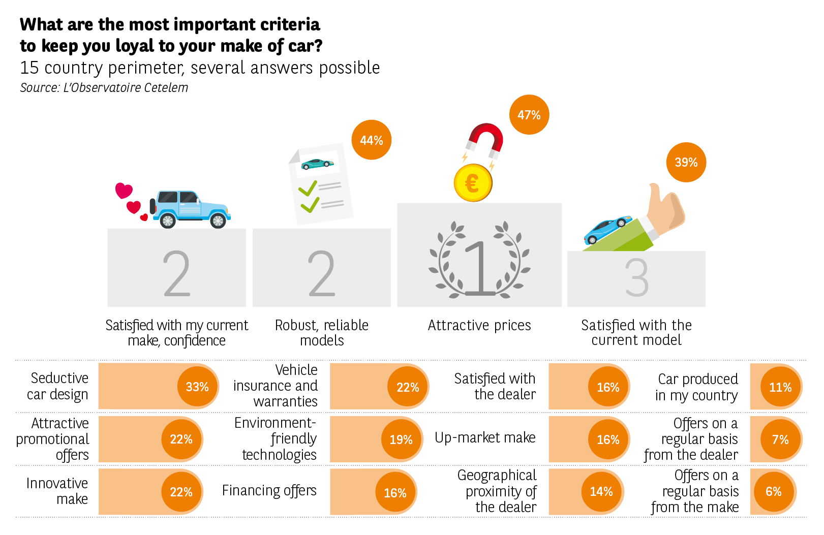 The formula may seem trivial, but loyalty also depends on price. When motorists are asked to rank their loyalty criteria, price comes top of the list with 47% of votes ahead of robustness and brand confidence. This top-ranking criterion is quoted by more than 1 respondent out of 2 in South Africa, the United States, Brazil, Turkey, and also in Germany where households often pay considerable prices for cars.