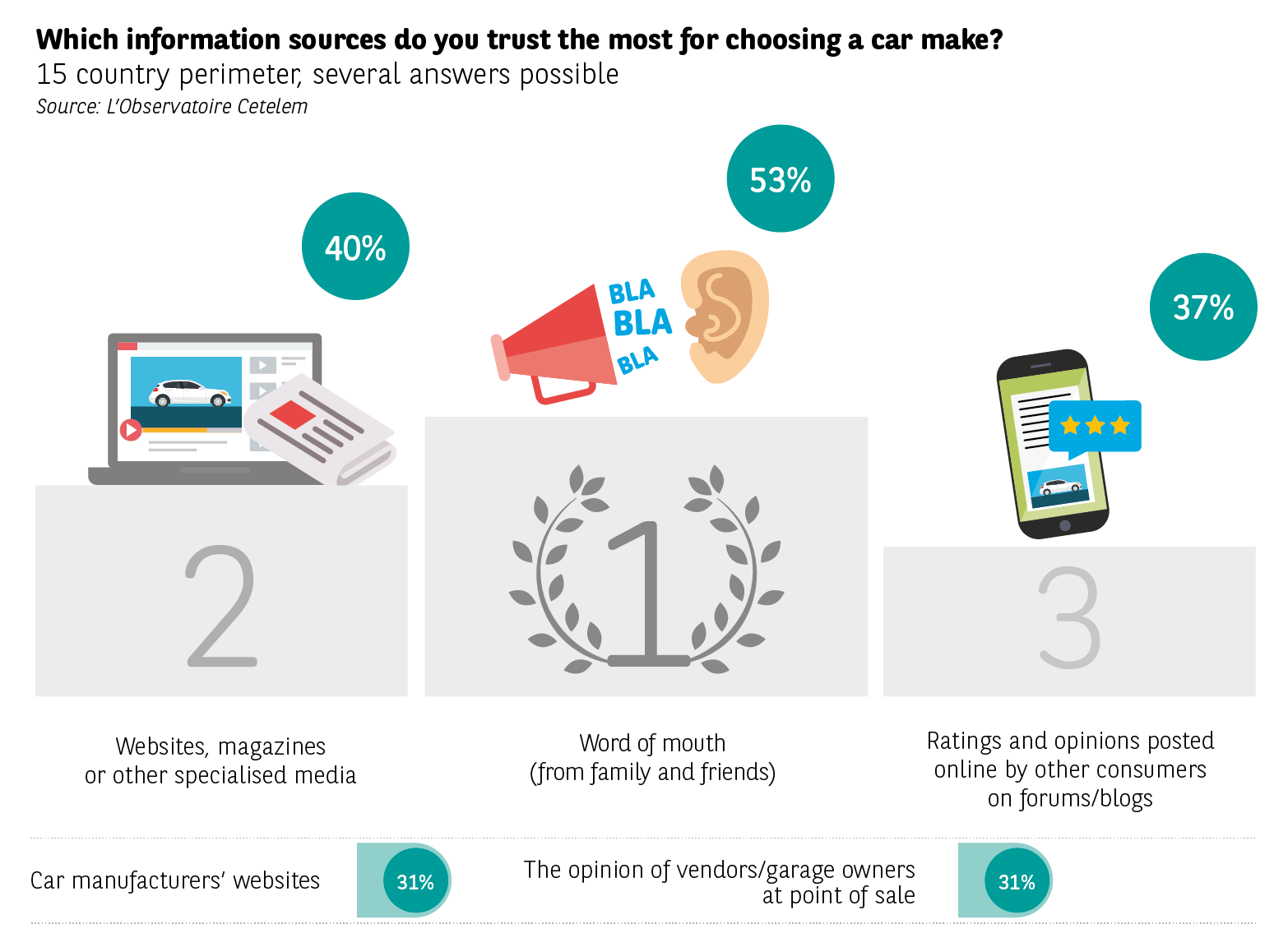 40% then consult the Internet, magazines or specialised media. The forums are worth a visit for 37% of the people surveyed, with vendor opinions and official manufacturer websites coming next (31%). As L’Observatoire Cetelem 2017 said, “gone is the time when consumers listened to just one opinion. What is now emerging is a cross-channel approach whereby they gain confidence by gathering a range of different viewpoints.”