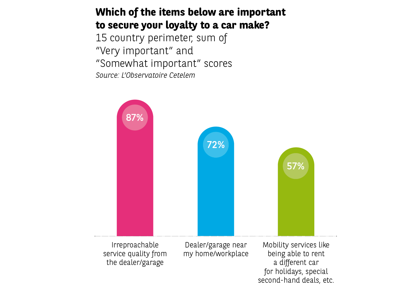 Therefore, although the tenants of the all-digital car trade might not like to admit it, 87% of motorists make a direct link between loyalty and a dealer’s service quality, as well as with geographical proximity (72%). The development of the dealership network, prime locations and controlled catchment zoning remain the essential components.