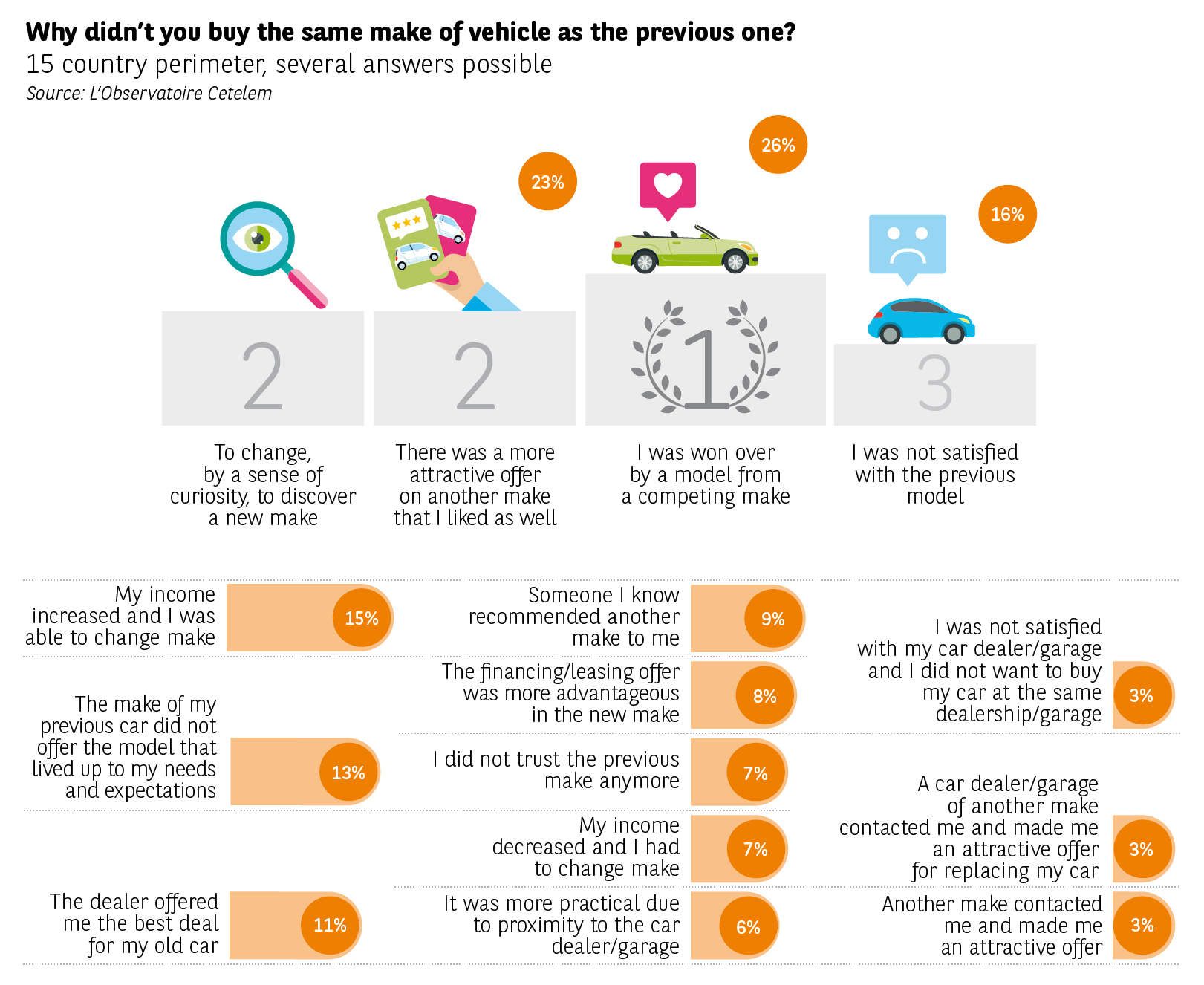 The second reason evoked is similar to the previous one (23%). It is curiosity, a desire for change, to discover a new make. The second neck-and-neck reason for non-loyalty is a more attractive offer made by another make, marking up as many votes. Like a mirror-effect for having remained loyal, the third reason for not remaining loyal resides in dissatisfaction with the previous model (16%). These results show that loyalty is won through trust in the make and lost through attraction to other makes.