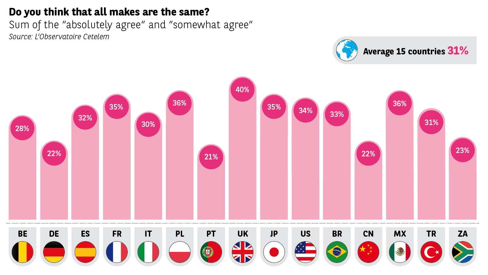 The good news is the question of makes is not seen as trivial. It could be tempting to believe that they were sacrificed on the altar of the multitude of offers and popular clichés that put them all on a par, or almost. But this is not the case at all. Nearly 80% of Germans, Portuguese, Chinese, and South Africans are convinced that car makes are not created equal. Whatever the country, they still seem to have their own rank and reason for being. In this time of ferocious competition both price-wise and range-wise, this is a very encouraging sign for marketers.