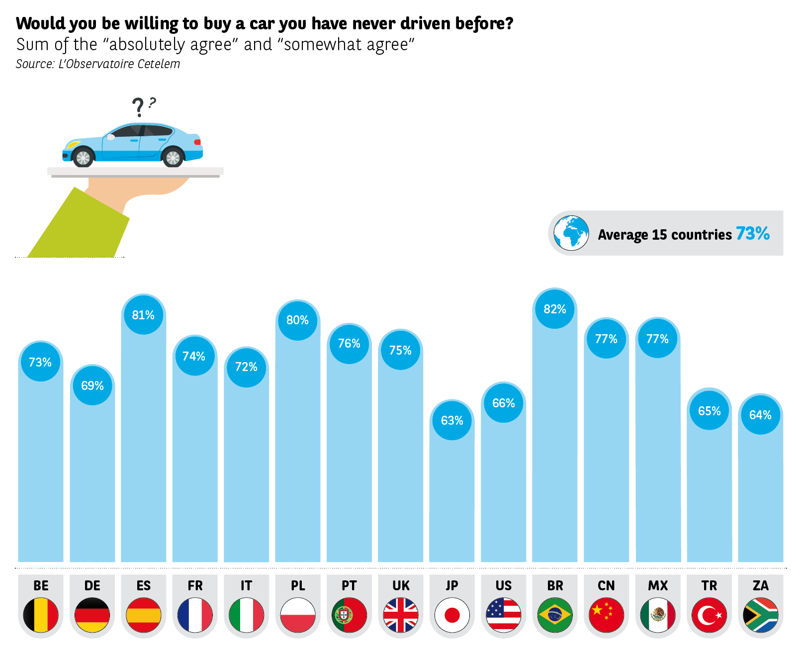 Motorists who want to change cars are therefore somewhat elusive, more so since they affirm, in 3 out of 4 cases, they are willing to buy a car they have never actually driven before. This proportion is almost exactly the same from country to country, with Japanese, Americans, Turks, and South Africans being hardly more careful (65% on average).