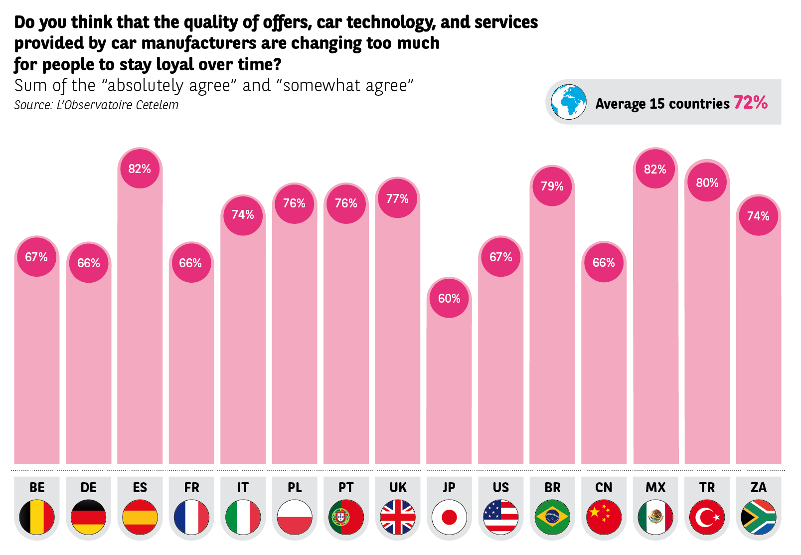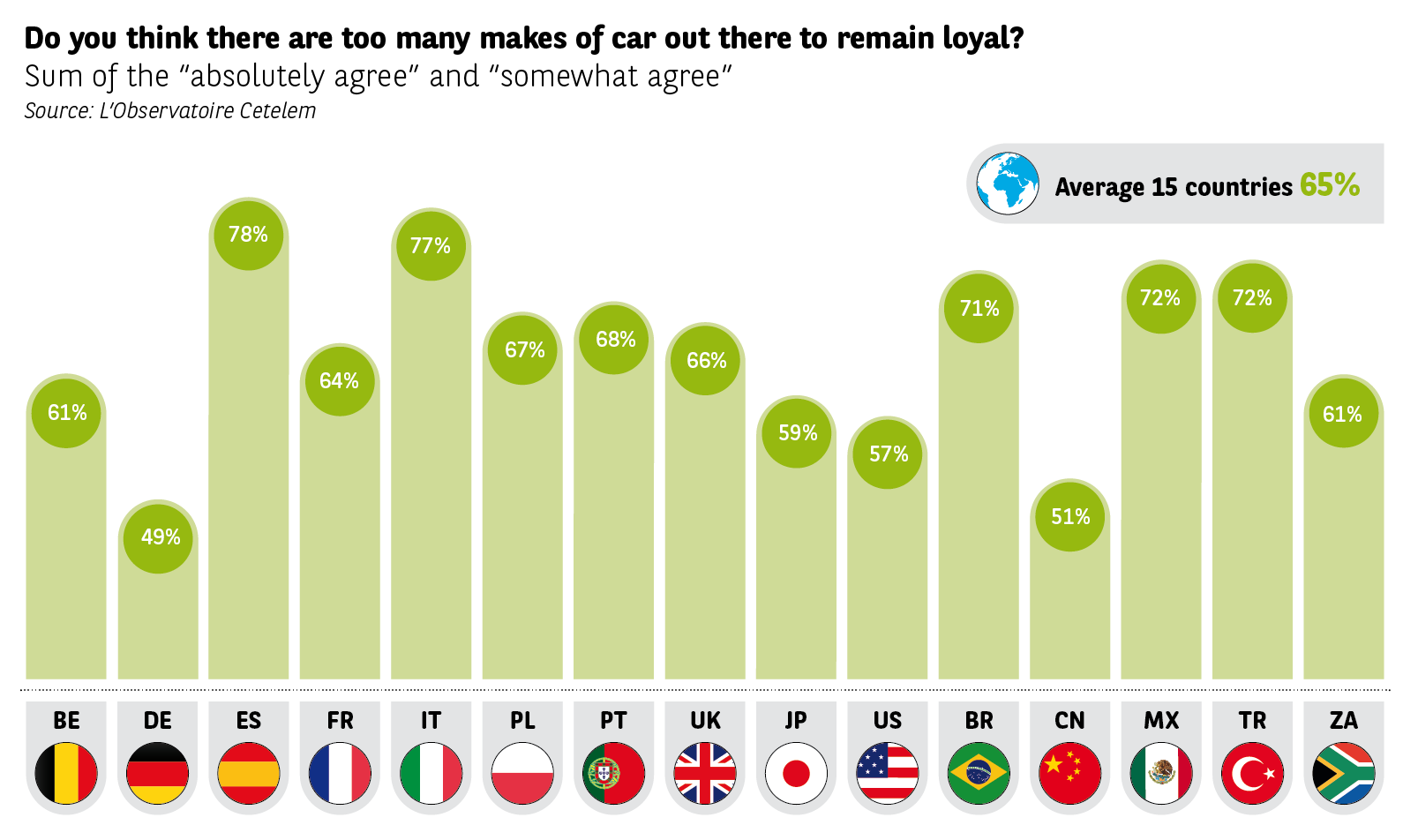 The multitude of car makes and hyper-choice is enough to make heads spin. Spanish (78%), Italians (77%), Brazilian (71%), Mexicans (72%), and Turks (72 %) are the most inclined to change, declaring that there are too many makes out there to remain loyal to one. German rigour and the Chinese penchant for belonging to a group, unless it’s to do with an aversion to risk, make them more conservative (respectively 49% and 52%).