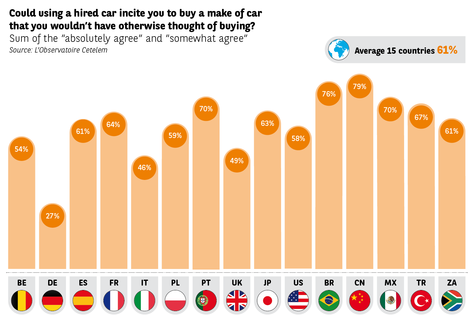 Consumer habits are changing, subscription-based usership is also increasingly popular, giving rise to many new experiences and thereby increasing the risk that car manufacturers will see their clientele going off to the competition. Hence, nearly 2 out of 3 motorists state that they would take advantage of a leasing or carsharing opportunity to buy another make of vehicle. In this domain, only the Germans are less adventurous.