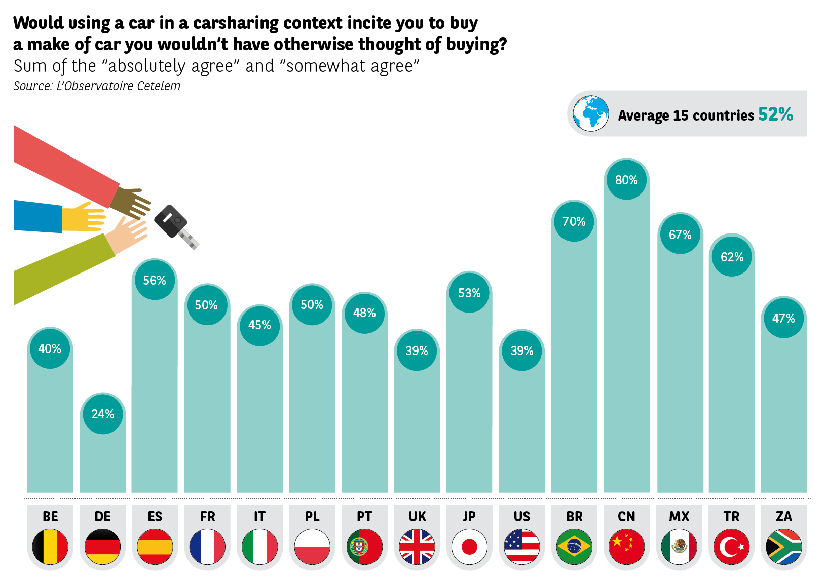 Yielding to temptation is not limited to these aspects alone. The Observatoire Cetelem de l’Automobile on low cost, showed, as from 2010, that expectations of some consumers had shifted towards more features and less status. In 2014, in the discussion on “shared transportation in the future”, they highlighted shared usership, and recourse to occasional or long-term car leasing. 3 out of 4 Europeans were in favour of carsharing and carpooling 10 years from now, associating the car with freedom of use, independence and autonomy.