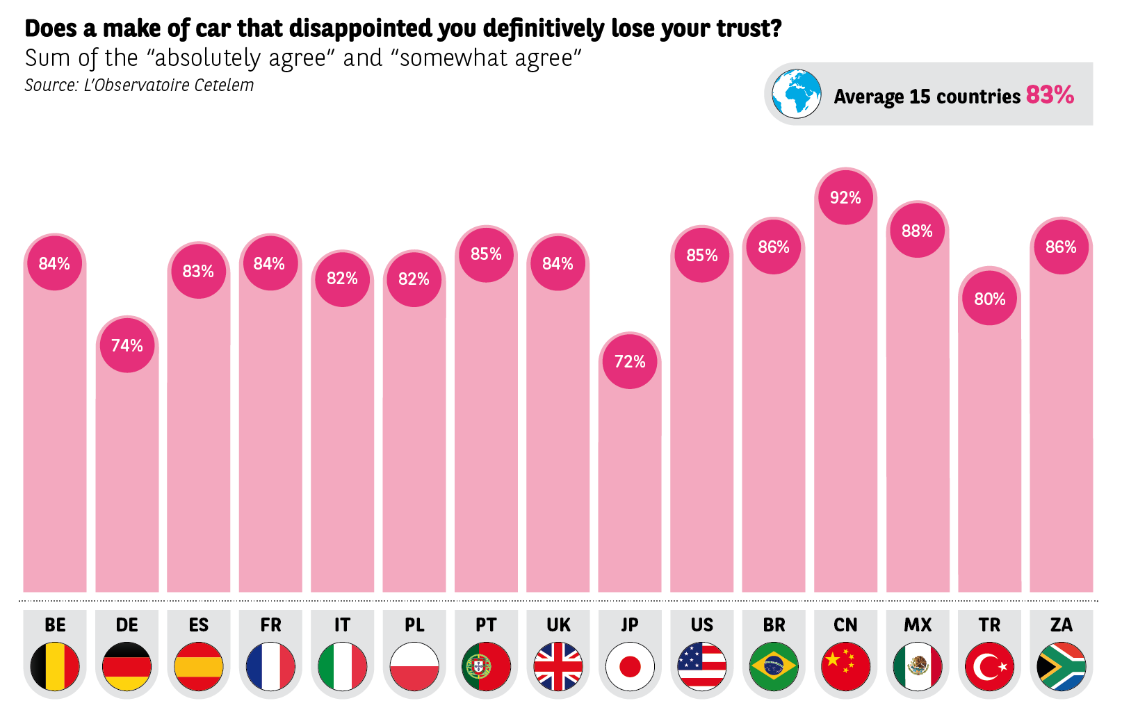 Even though motorists can be easily tempted by a new model, they are categorically intransigent in the event of a disappointment. 83% of interviewees state that there is no possible recourse if they lose trust in a make of car. Behind this strong unanimity, the Japanese and the Germans leave the most room for forgiveness (respectively 28% and 26%): two countries that are very attached to their national car makes, both of which have recently veered off the straight and narrow.