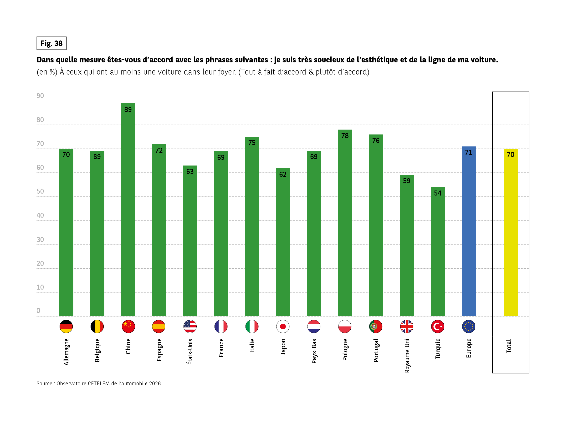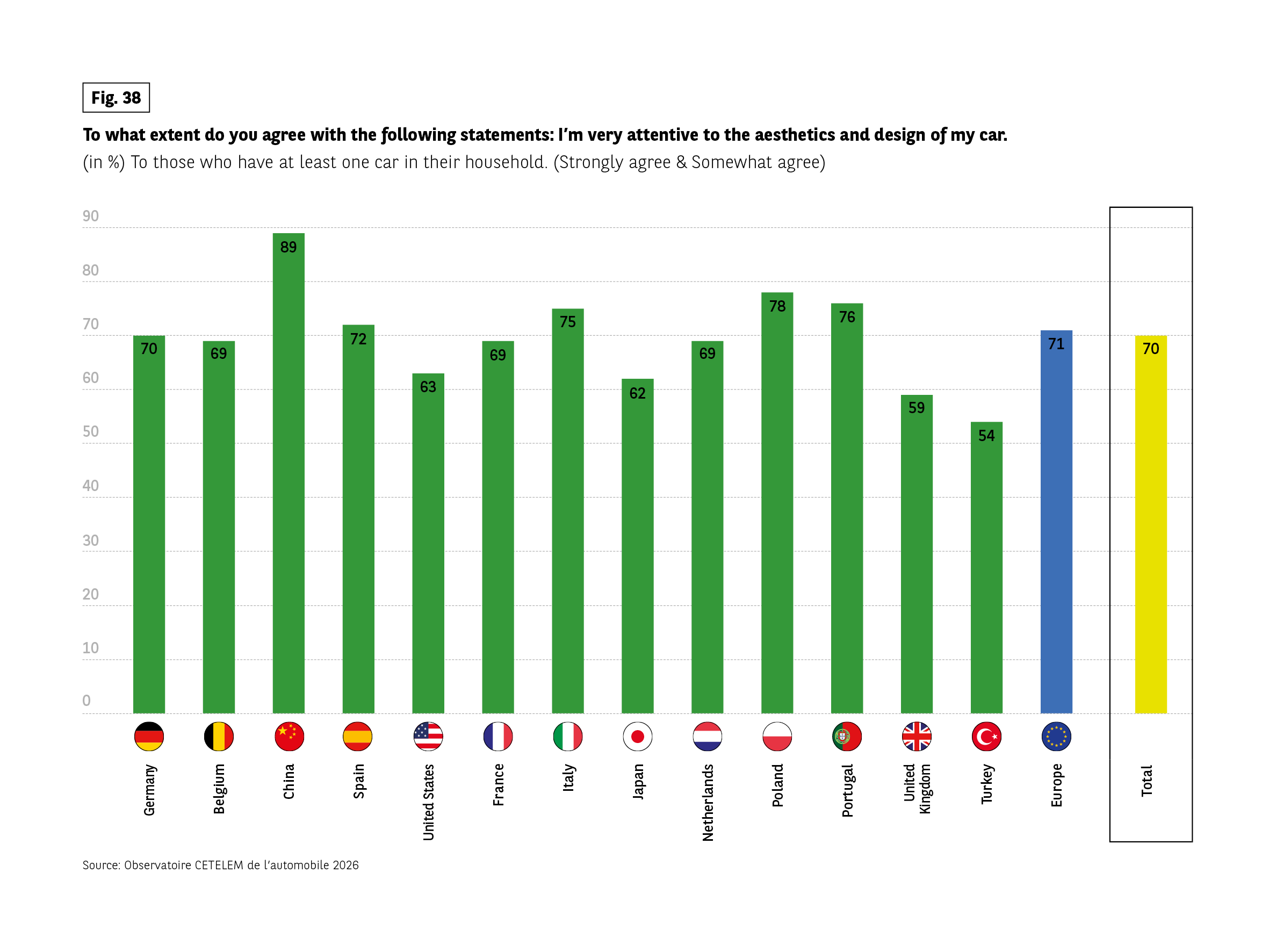 This is particularly true in China, where an ostentatious side has persisted more than in other countries in recent years, even if the days of parading down the avenues of major Chinese cities in testosterone-fuelled racing cars seem (quite rightly) to be over. However, this is also the case in Italy, Poland and Portugal. For once, the Turks are at the very bottom of the rankings, their low opinion of 54% reflecting a more pragmatic than aesthetic approach to the car.