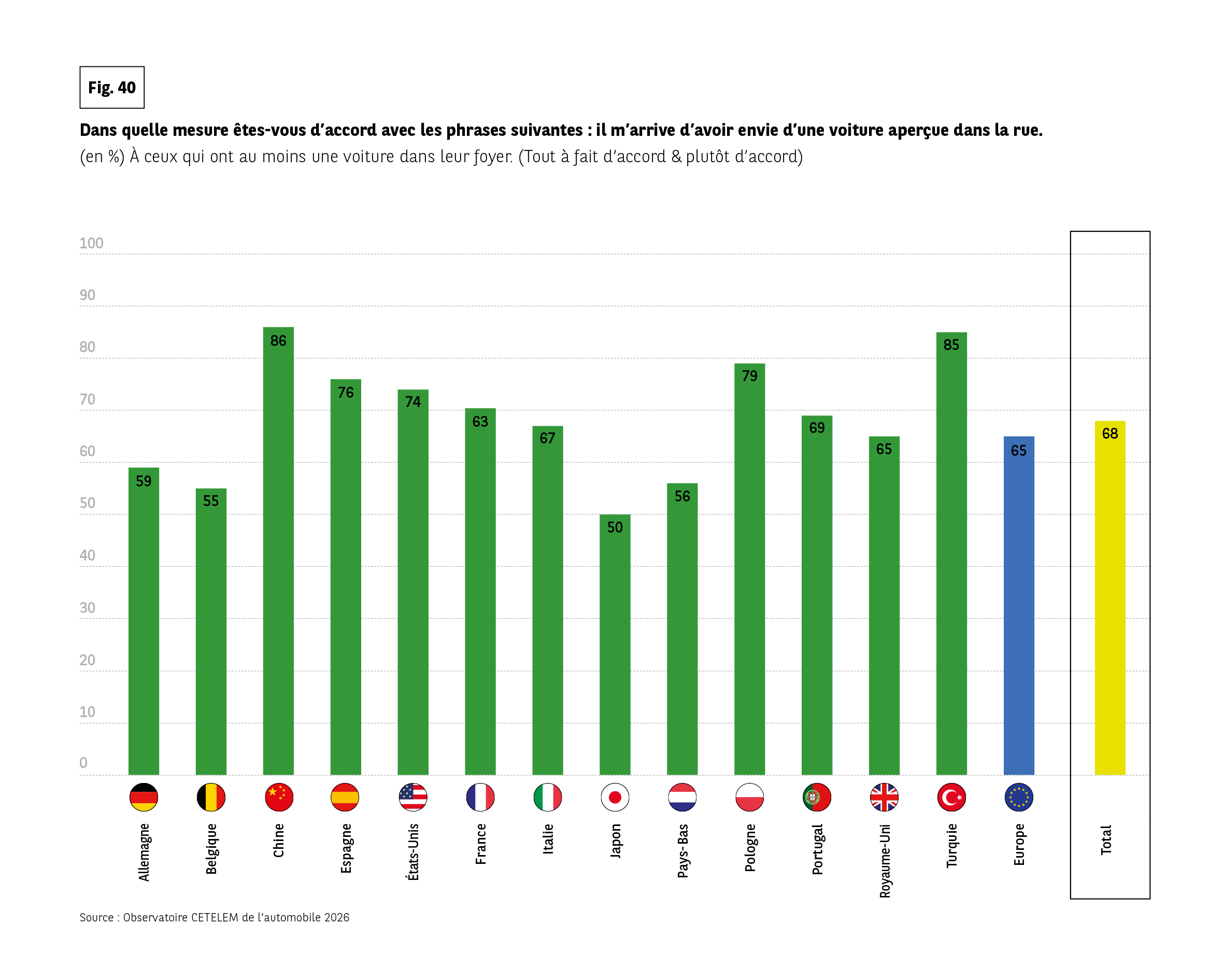 Allemagne 59, Belgique 55, Chine 86, Espagne 76, États-Unis 74, France 63, Italie 67, Japon 50, Pays-Bas 56, Pologne 79, Portugal 69, Royaume-Uni 65, Turquie 85, Europe 65, Total 68.