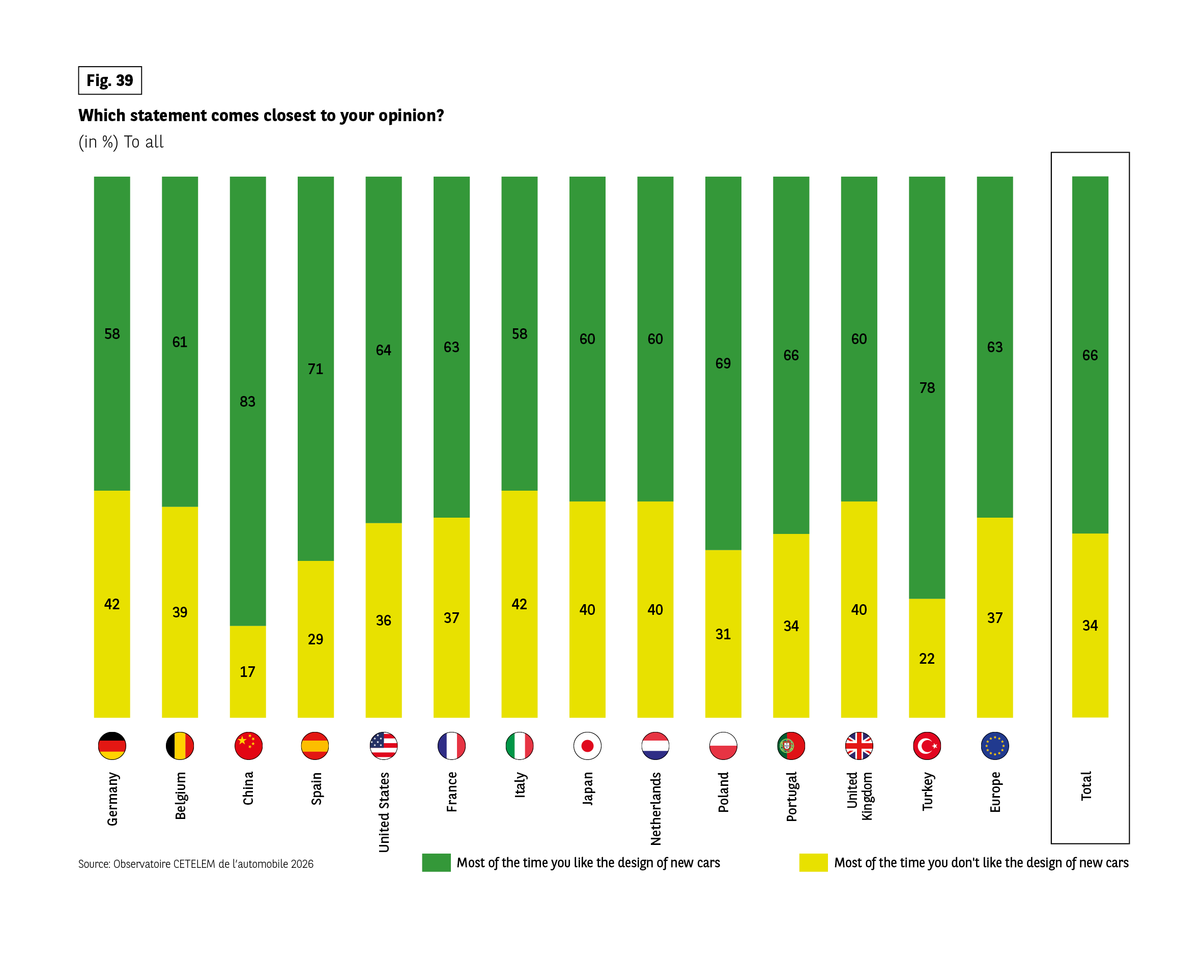 Key pattern: In all countries, a majority report liking the design of new cars. China and Turkey show the highest positive perception.