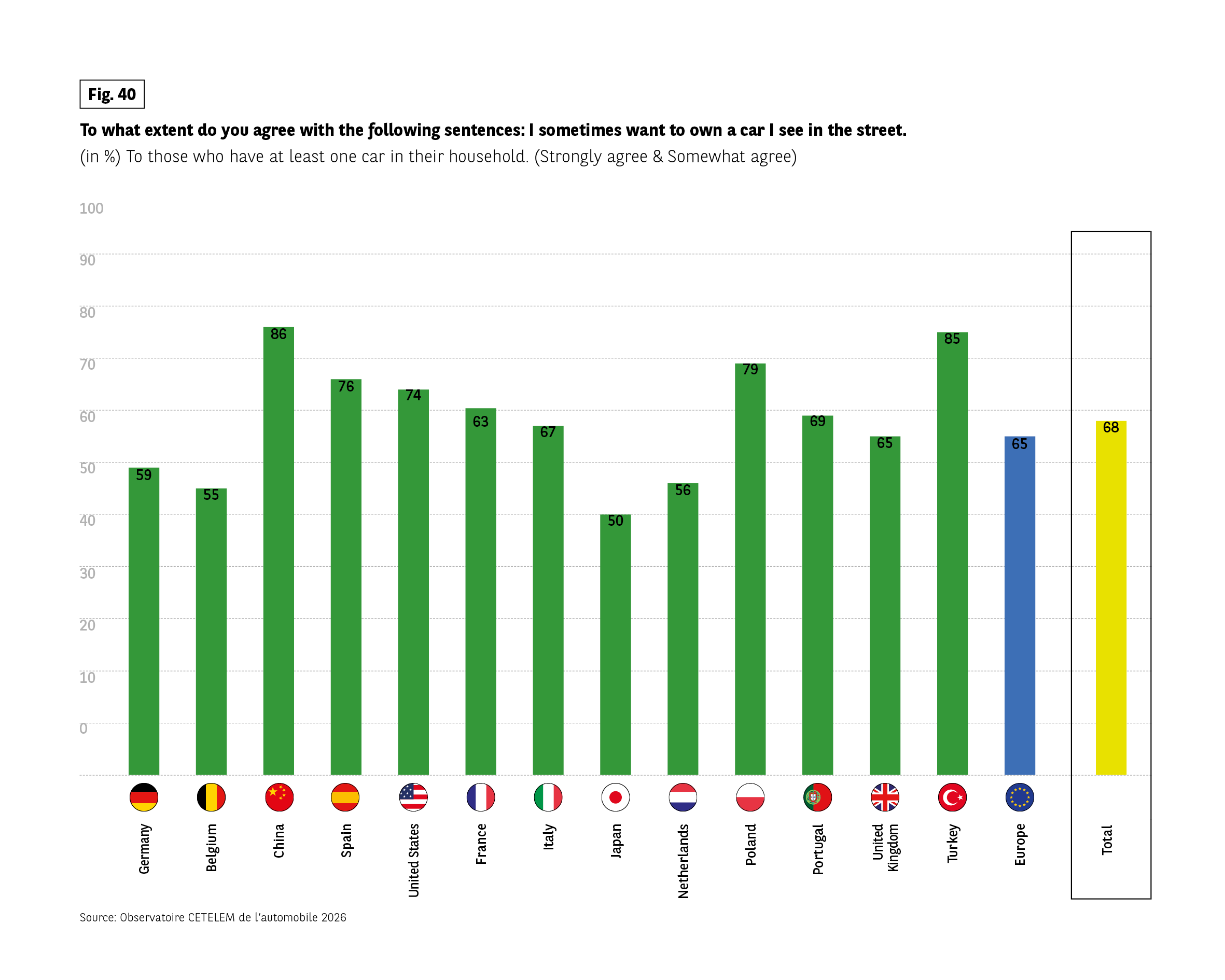 Context: Agreement with the statement “I sometimes want to own a car I see in the street”, among households owning at least one car.