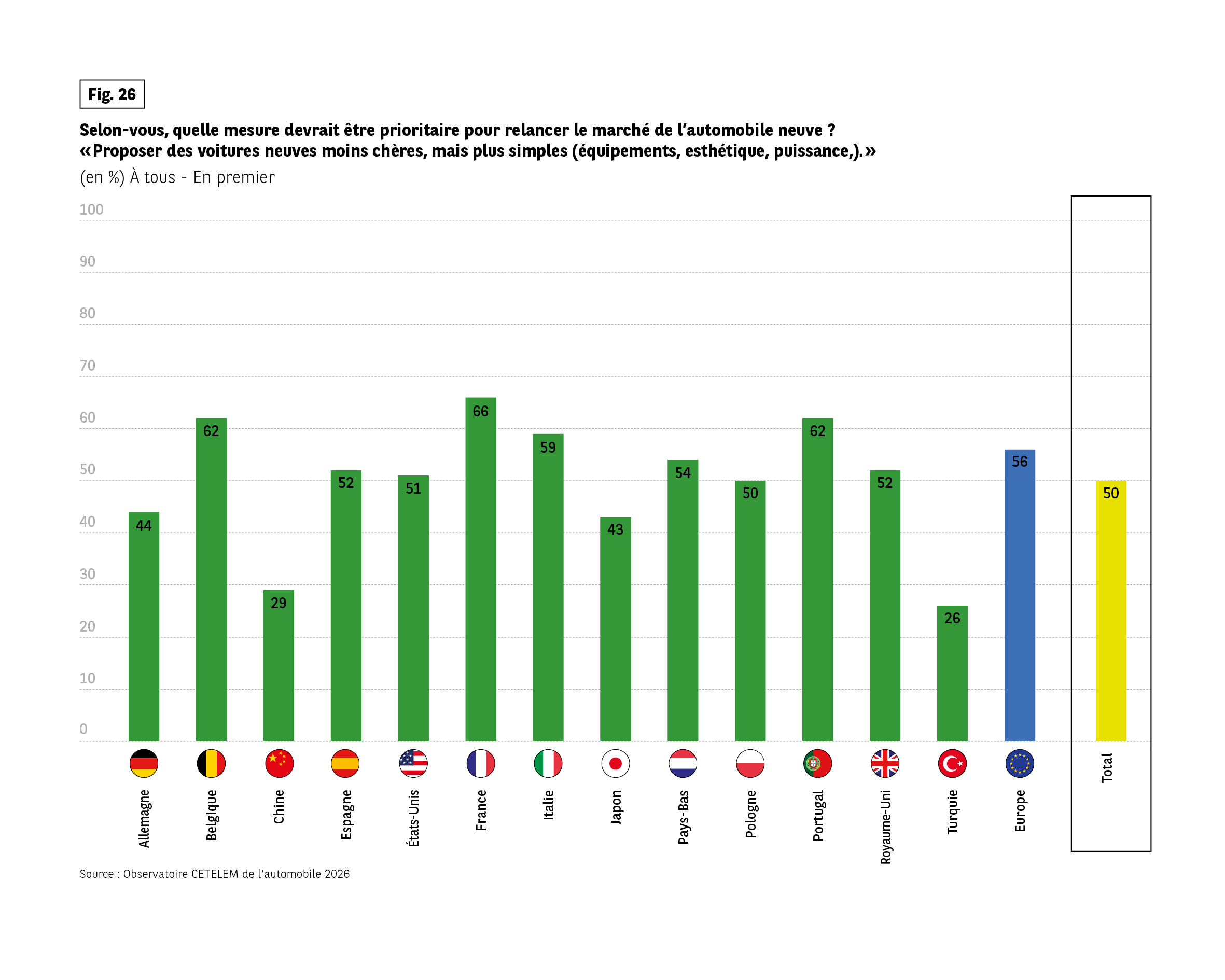 We have already seen the importance attached to the price of cars, with their ever-increasing cost being denounced in all countries except China. It’s hardly surprising that lowering vehicle prices is the first lever identified. Making cheaper and simpler cars is a priority for 1 in 2 people in order to revive the market. (Fig. 26).