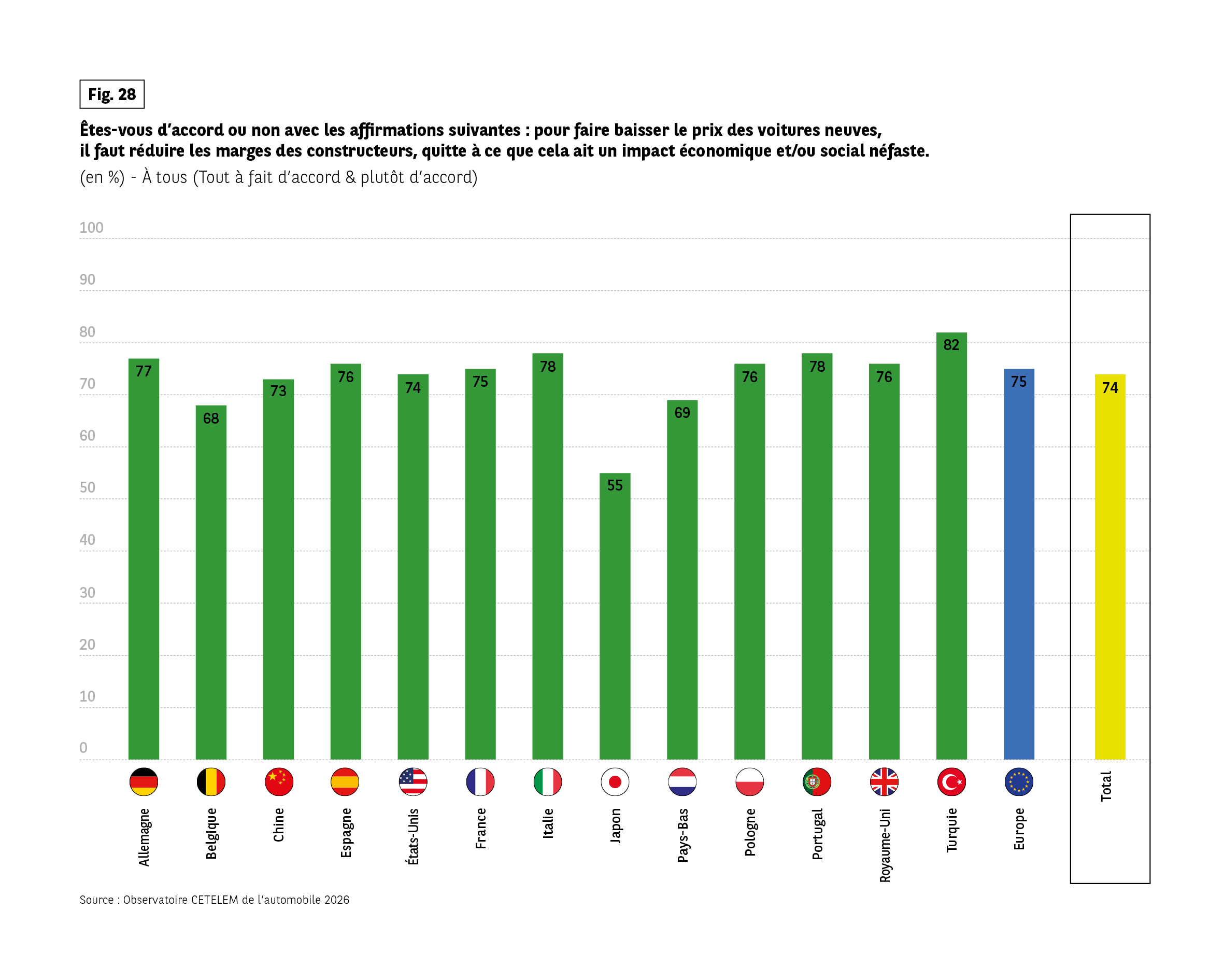 Allemagne 77 %, Belgique 68 %, Chine 73 %, Espagne 76 %, États-Unis 74 %, France 75 %, Italie 78 %, Japon 55 %, Pays-Bas 69 %, Pologne 76 %, Portugal 78 %, Royaume-Uni 76 %, Turquie 82 %, Europe 75 %, Total 74 %.