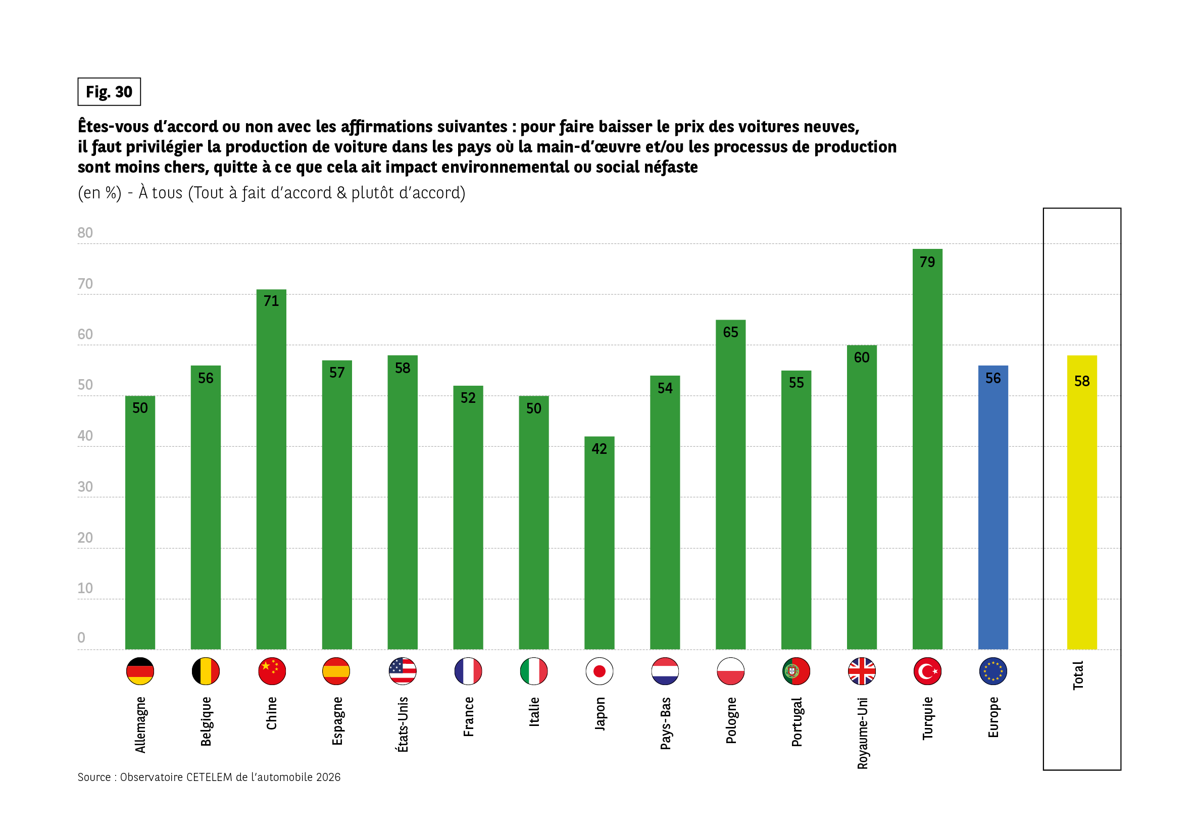 Allemagne 50 %, Belgique 56 %, Chine 71 %, Espagne 57 %, États-Unis 58 %, France 52 %, Italie 50 %, Japon 42 %, Pays-Bas 54 %, Pologne 65 %, Portugal 55 %, Royaume-Uni 60 %, Turquie 79 %, Europe 56 %, Total 58 %.
