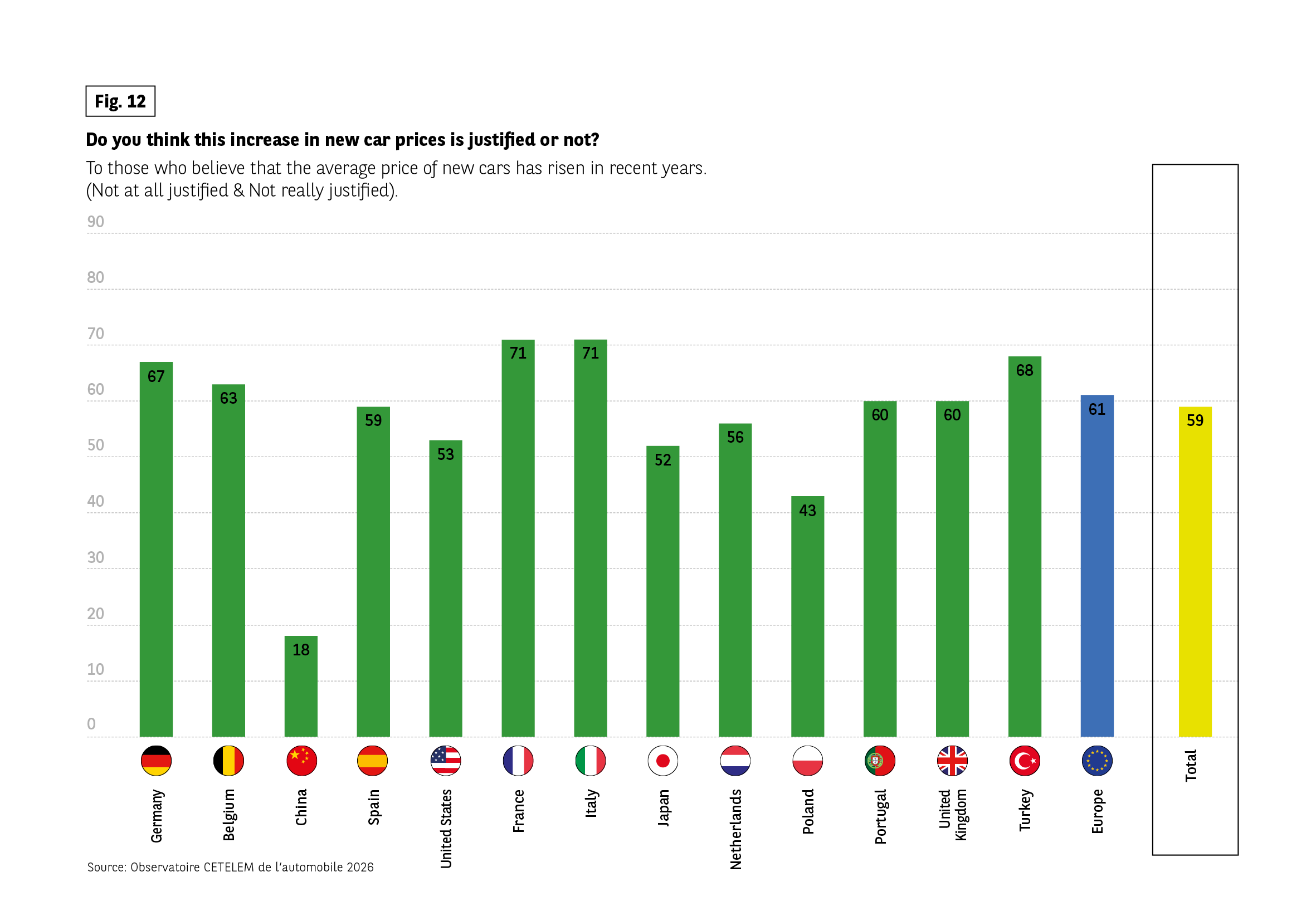 This perception of high prices is reinforced by the impression that car prices have done nothing but increase recently. 84% of those questioned were somewhat or totally convinced of the fact, particularly the Turks, Italians and Portuguese (94%, 92% and 92%). What about China? Only half of Chinese people think that prices have risen in recent years. Seniors are more likely to point out this price increase than younger people, as are people living in rural areas compared to those in large towns or cities.