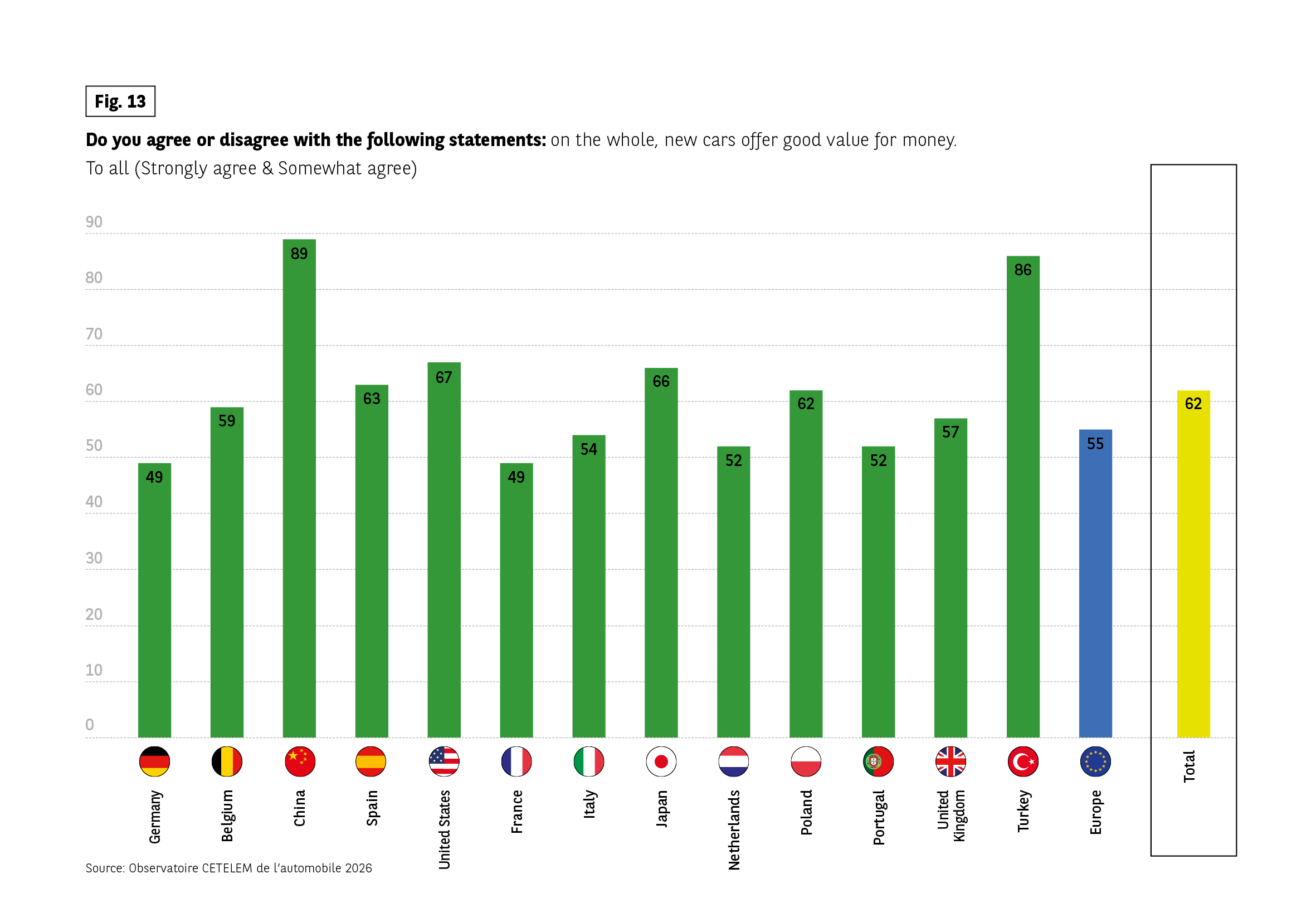 And yet, motorists are lowering the level of their complaints and raising the level of their satisfaction with vehicles’ value for money. 6 out of 10 consider it to be good, which implicitly highlights the fact that the overall technological development of cars has been taken into account and that there has been a real improvement in quality. A group of four countries stands out for its value for money, with China and Turkey once again in the lead, followed by the United States and Japan.