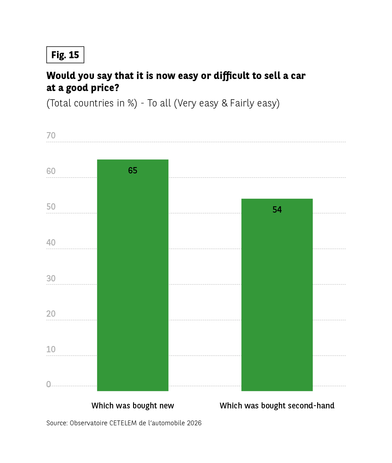 This positive outlook on future purchases is coupled with an even more favourable outlook in terms of resale, an argu- ment that undoubtedly plays a role in the purchase of a new car. 65% of those questioned believe that it is now easy to resell a vehicle of this type.