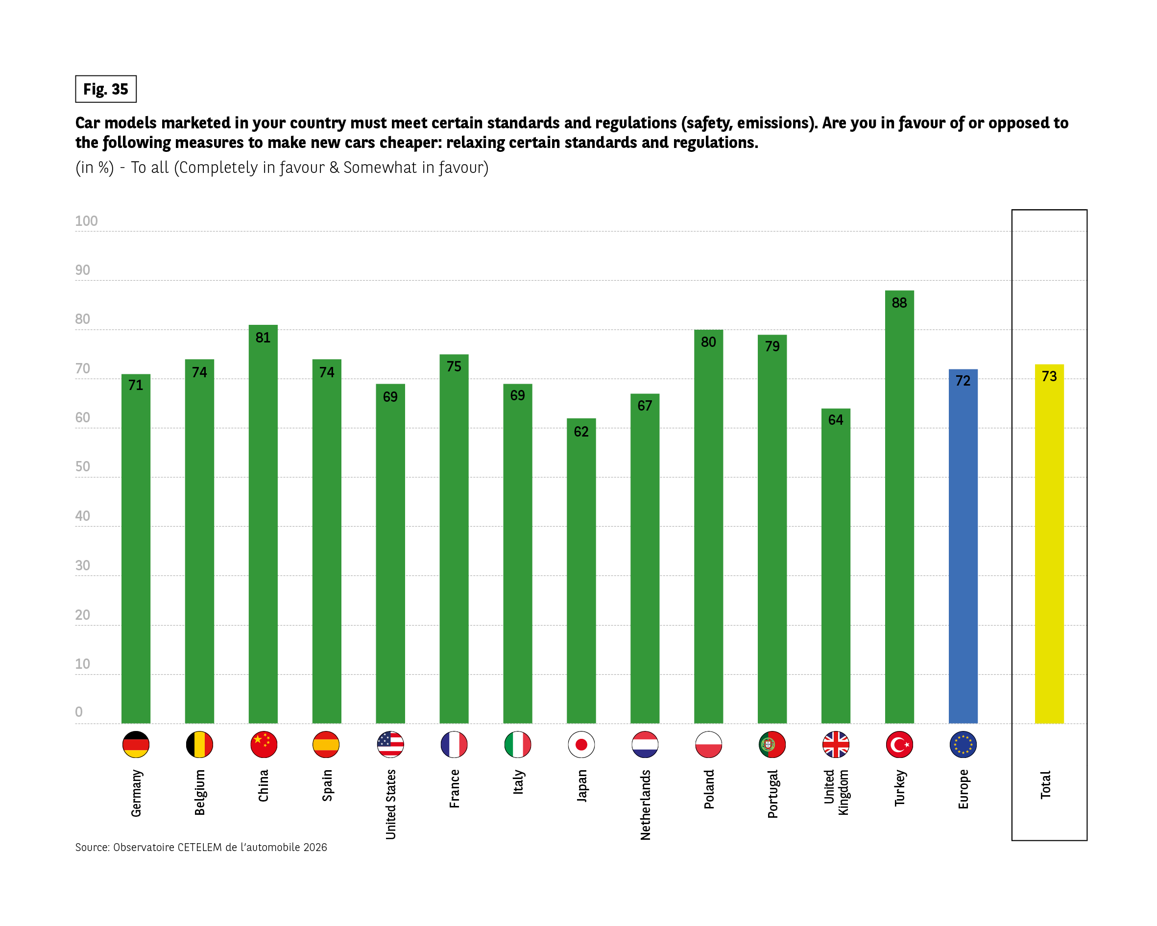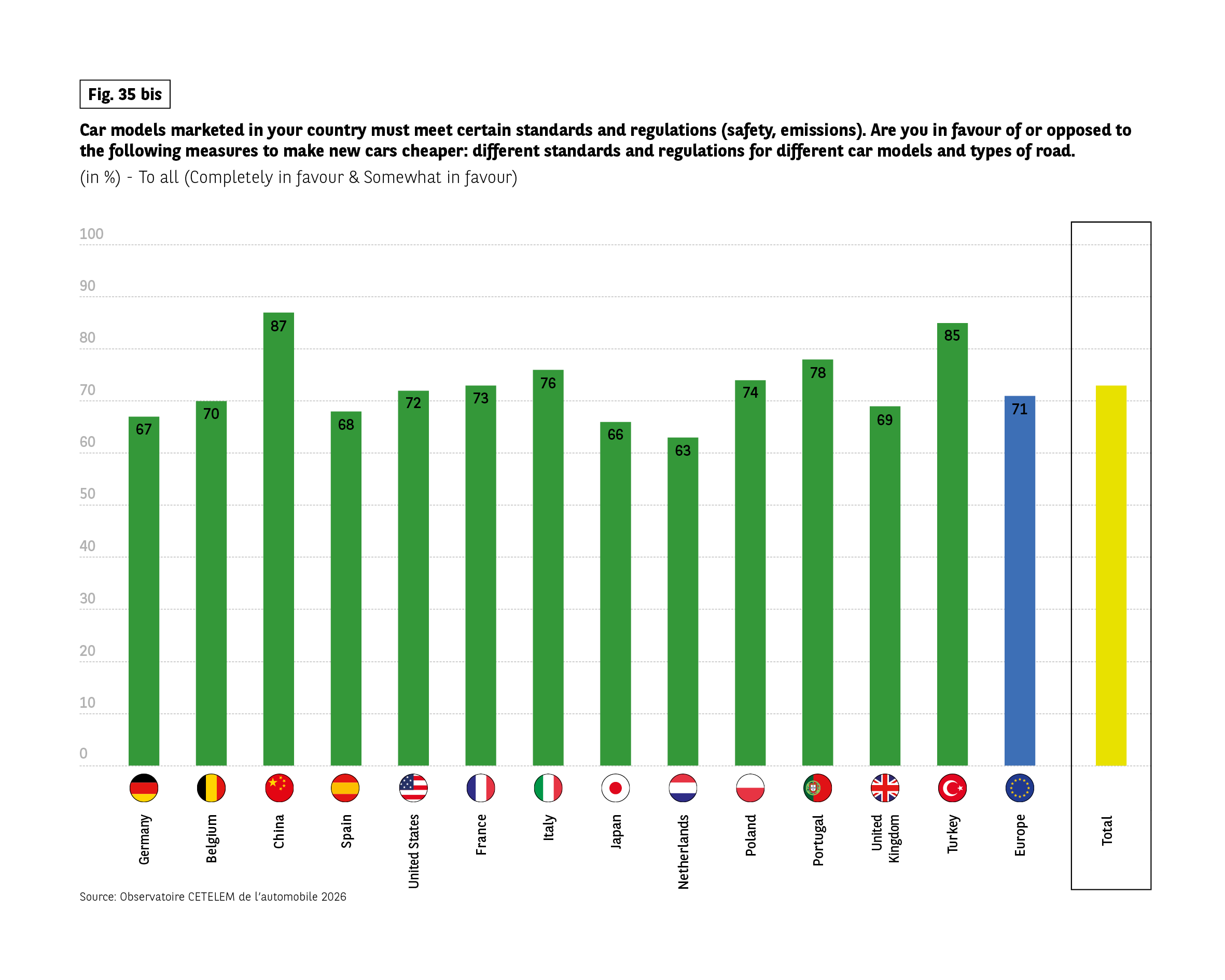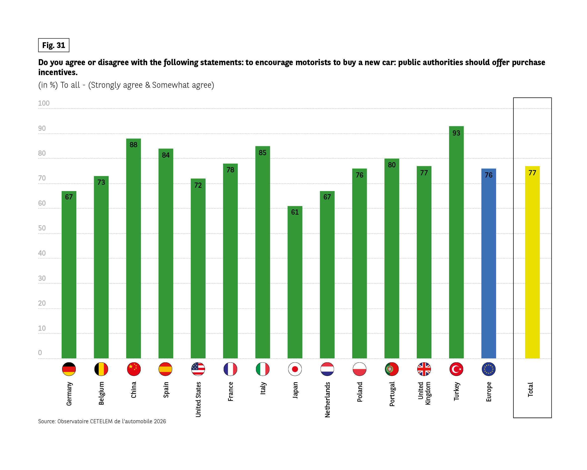 However, when it comes to certain issues, which are still linked to the economic dimension, motorists sometimes have very clear ideas. This is the case for purchase incentives, which have been very well received. (Fig. 31). Nearly 8 out of 10 people are in favour. Once again, the Japanese are the most reserved (61%), in contrast to the Turks and Chinese, who are strongly in favour. Mediterranean countries score above the survey average.