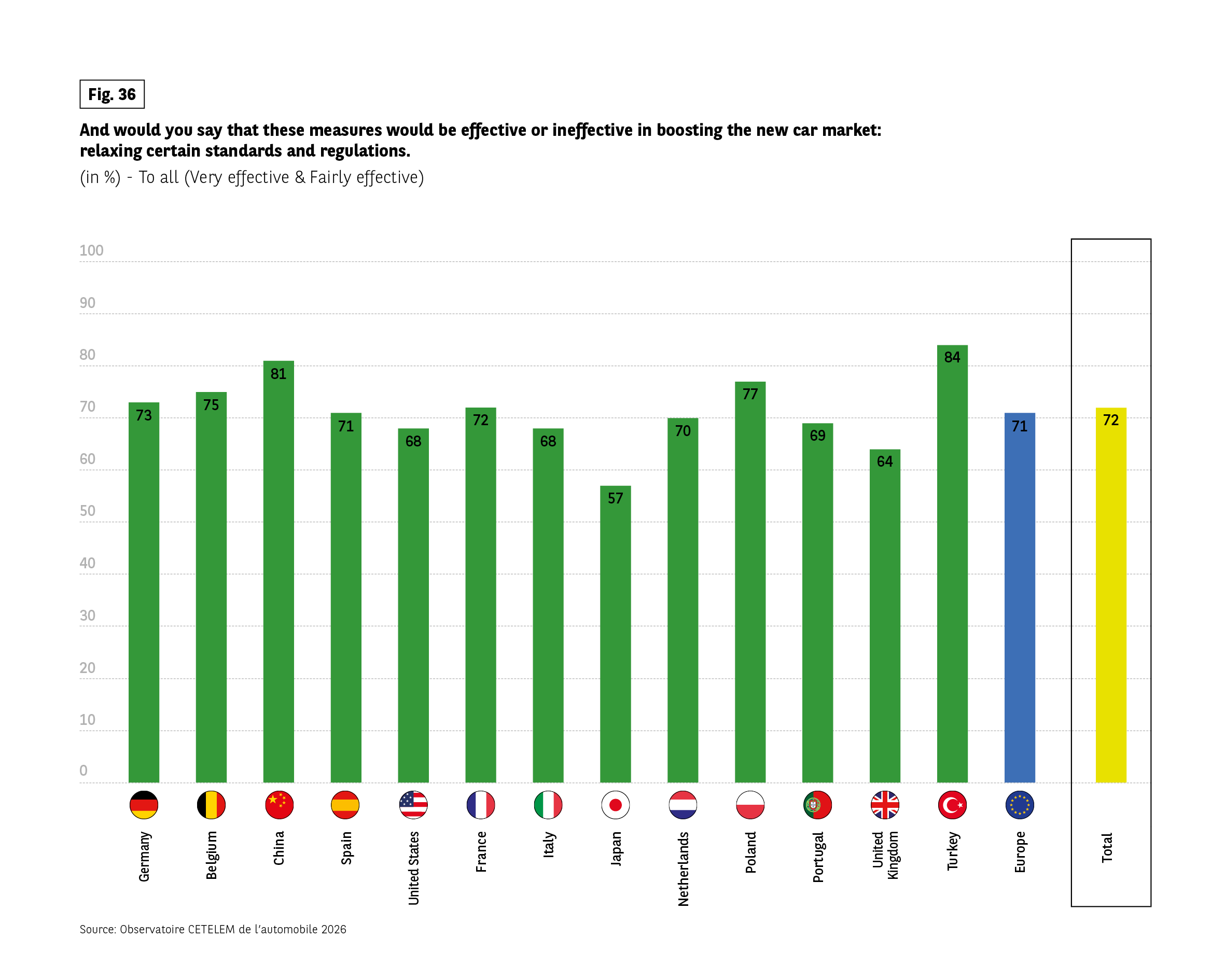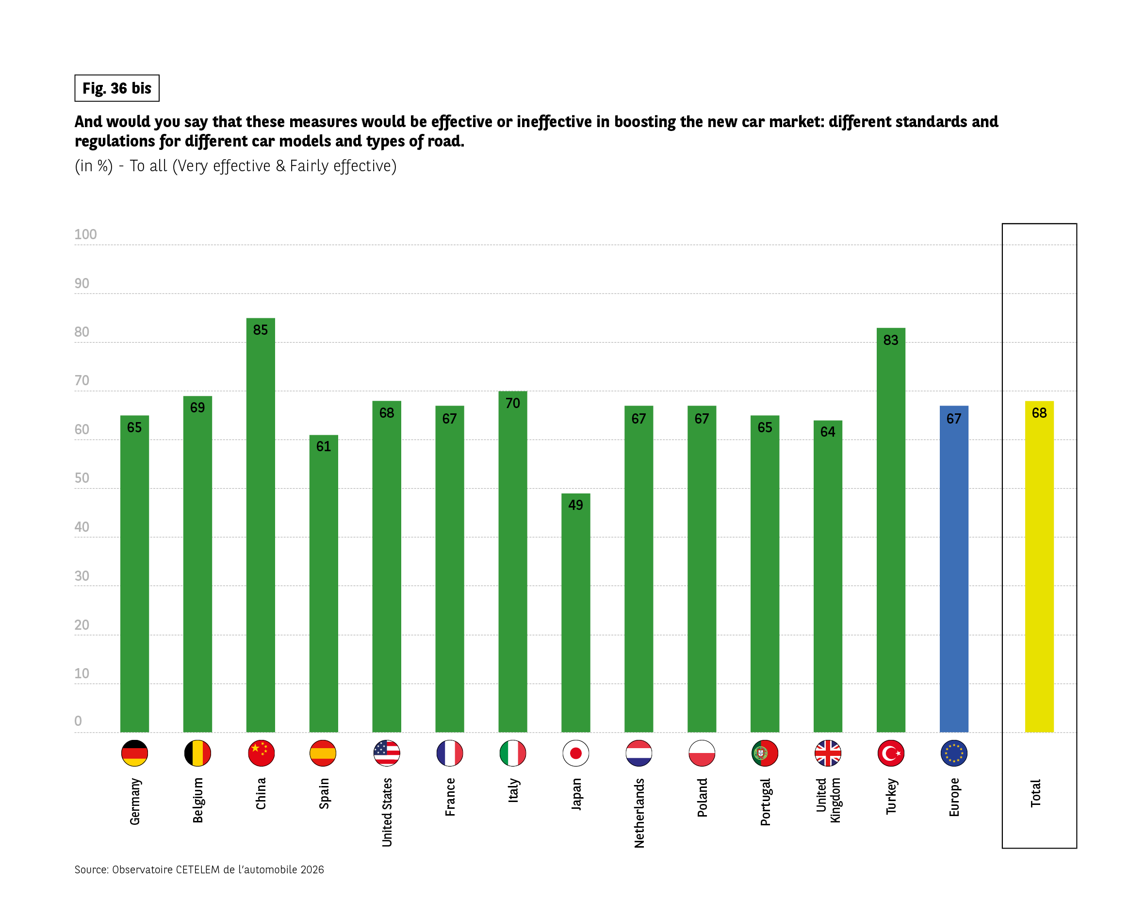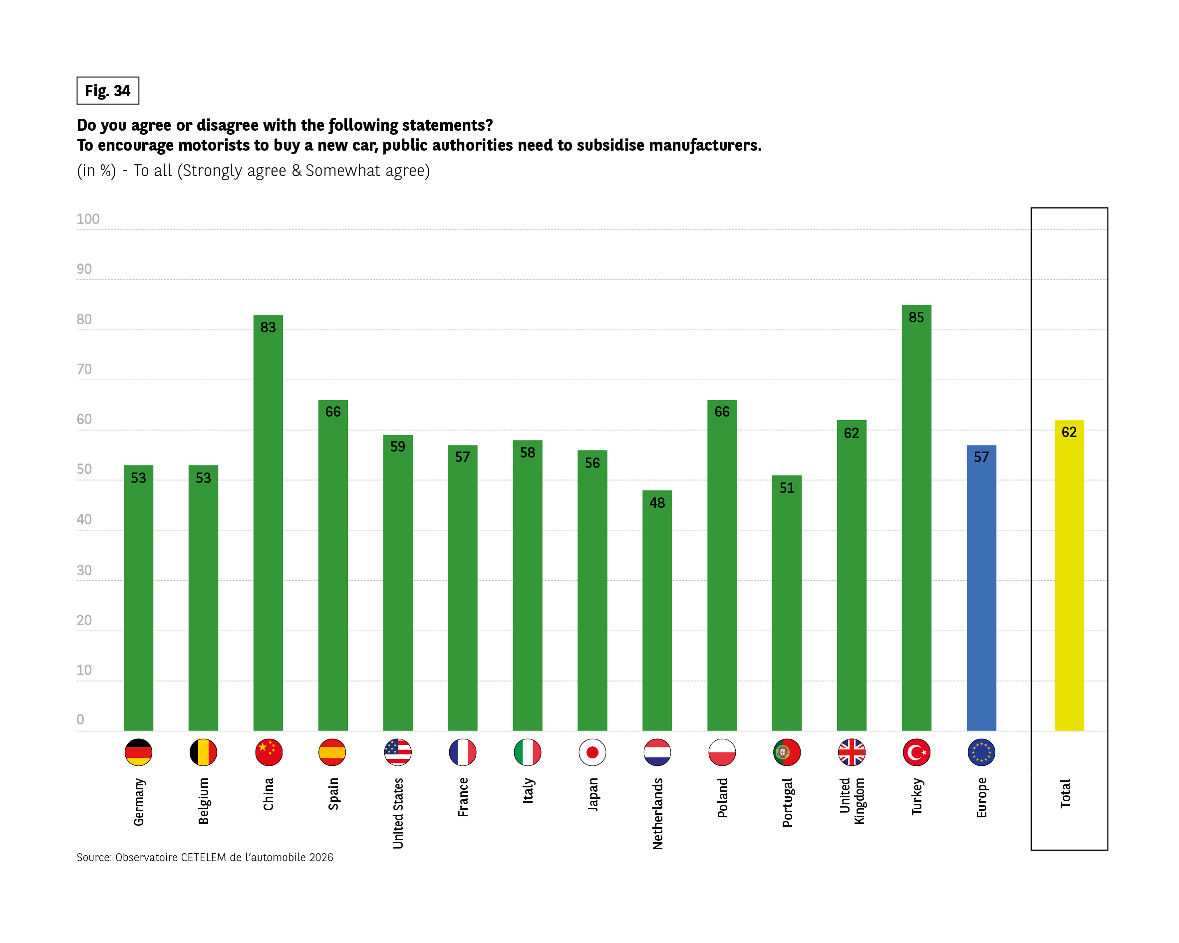 To a lesser extent, motorists also agree on the financial support that public authorities should give to manufacturers in order to boost the market (62%). This idea is seen as an obvious decision in Turkey and China, where it is already being put into practice, more or less directly. (Fig. 34).