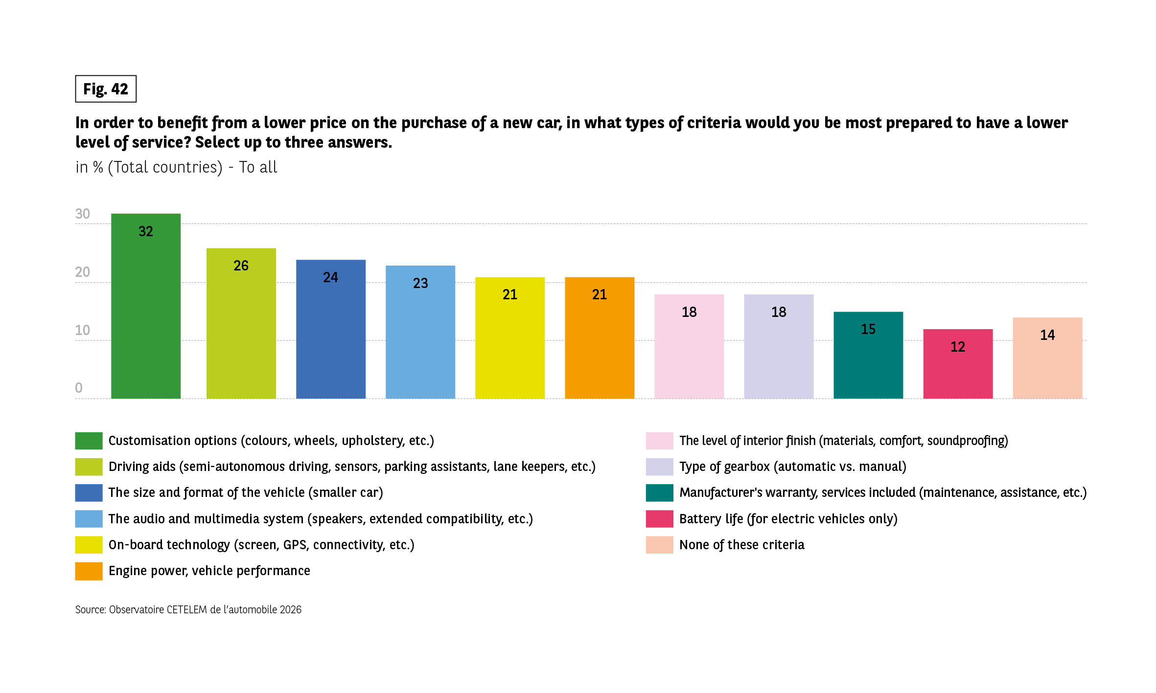 There should be simplicity in terms of choice, but also when it comes to technology. The idea of reducing driving aids to cut costs comes second in this ranking (26%). Somewhat surprisingly, the technophile Chinese and Americans are the most likely to want this.