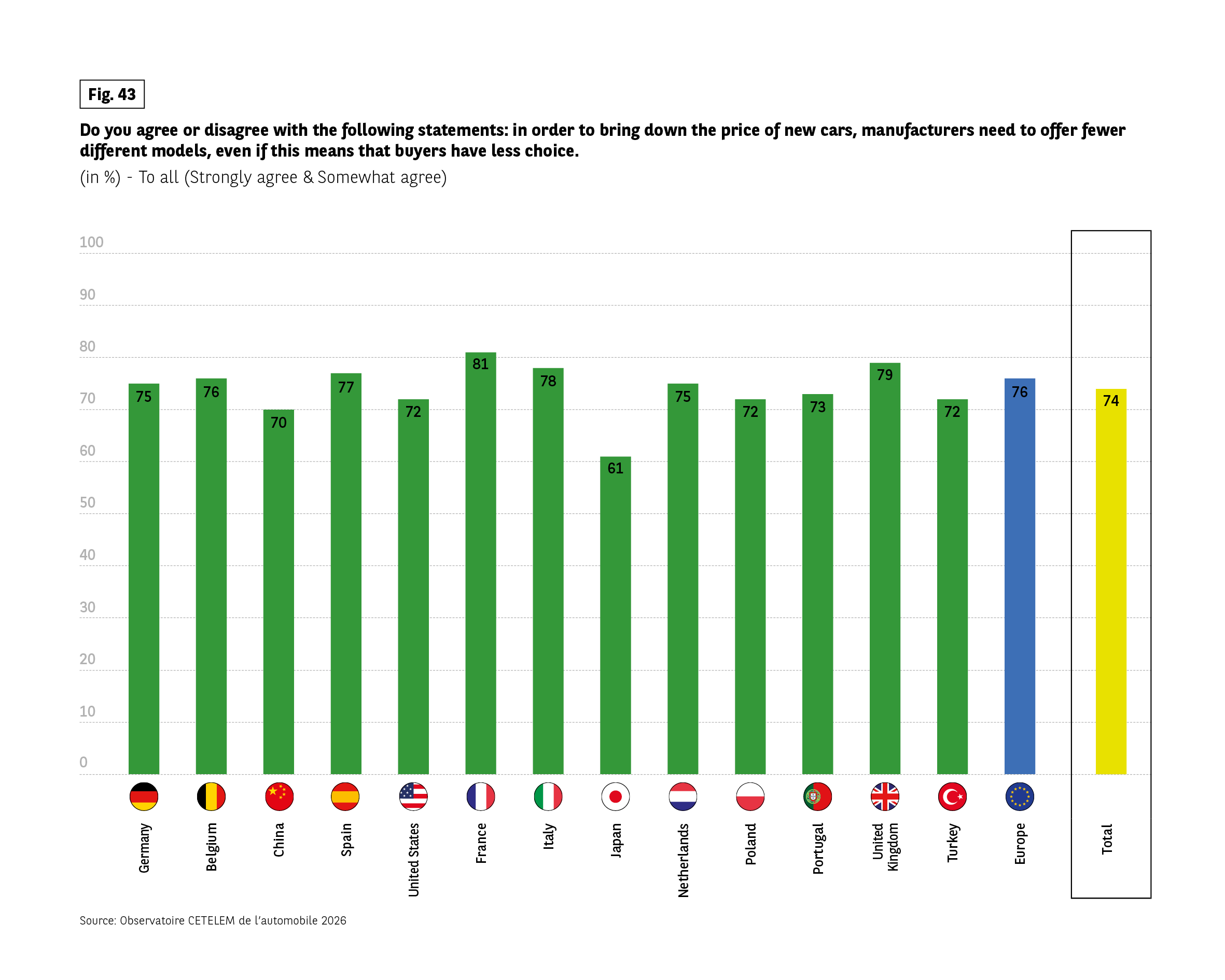 Three-quarters are in favour of fewer models being built. In most countries, opinions on this subject are relatively similar, except in Japan where there is less interest in reducing the offering. The French lead the way on this point, ahead of the British.