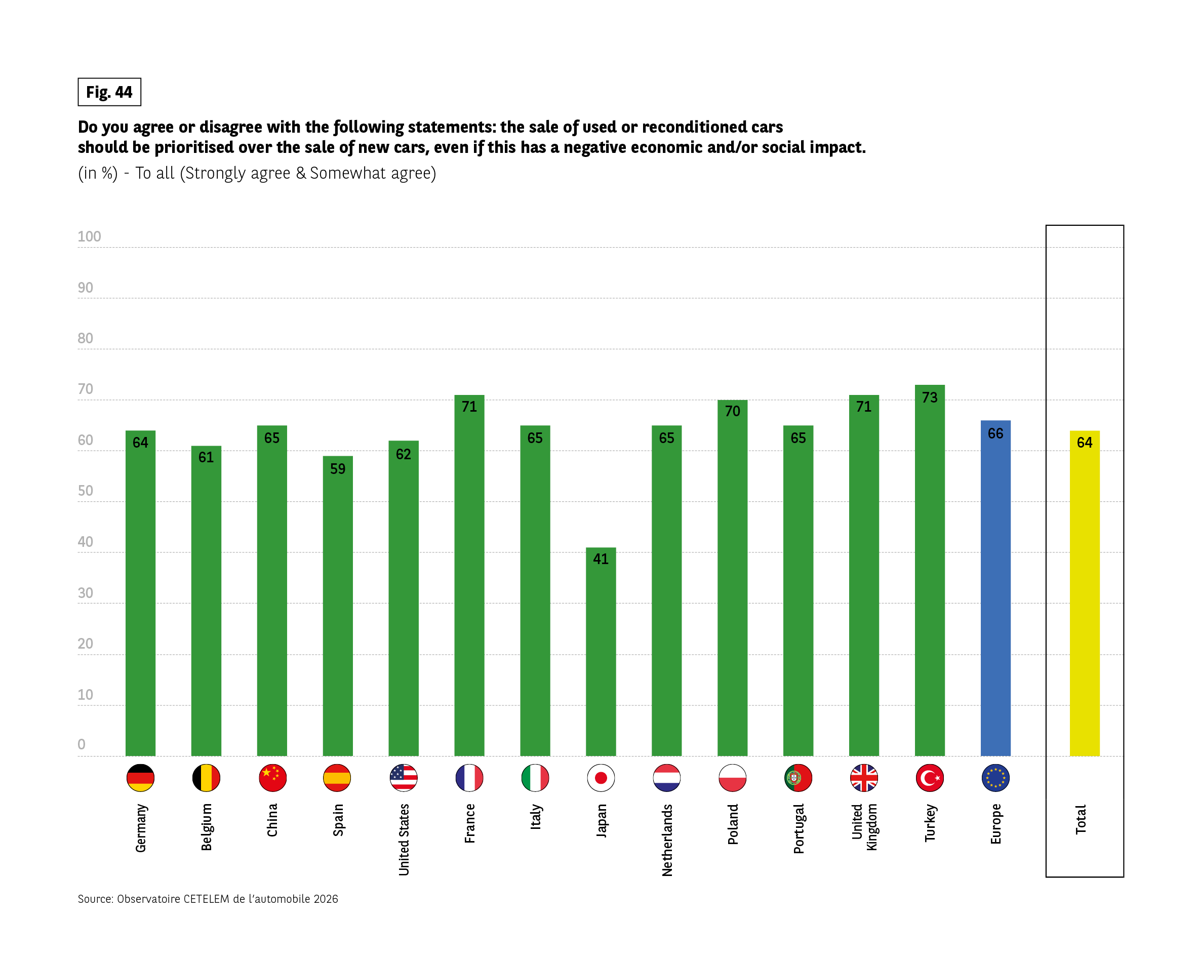Key pattern: A majority support prioritising used cars in most countries, with notably lower support in Japan.