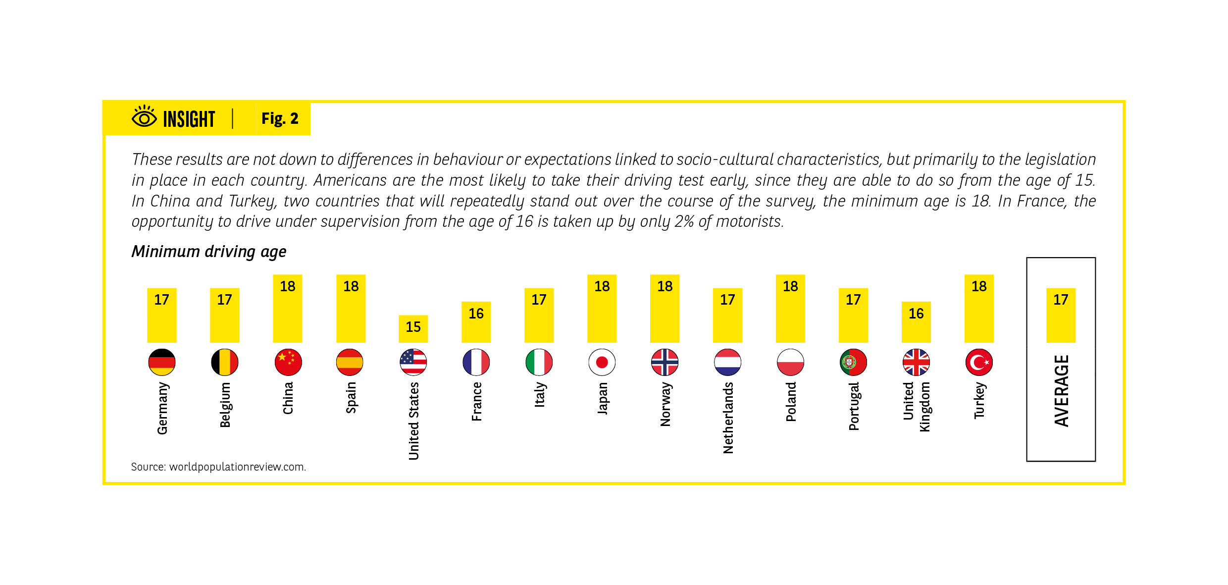 Context: the minimum age results mainly from the legal framework specific to each country rather than cultural differences. Americans are more likely to obtain their license earlier because they can start driving at 15 years old. In China and Turkey, access is set at 18 years old. In France, although accompanied driving is possible from 16 years old, only 2% of drivers use it.
