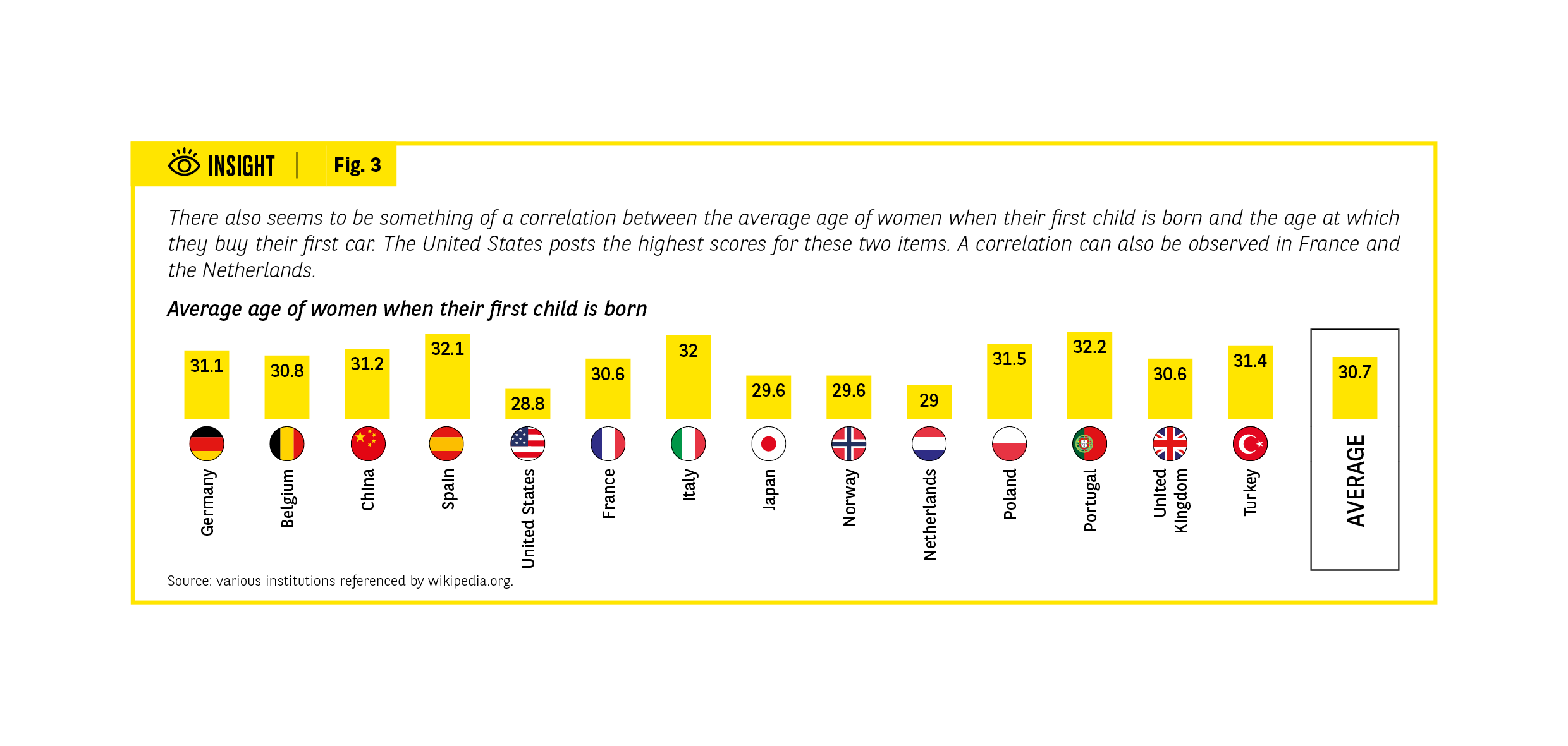 Context: the comparison between the average age at first child and the age of buying a first vehicle reveals convergences, particularly in the United States where both values reach the highest levels. A similar concordance appears in France and the Netherlands.