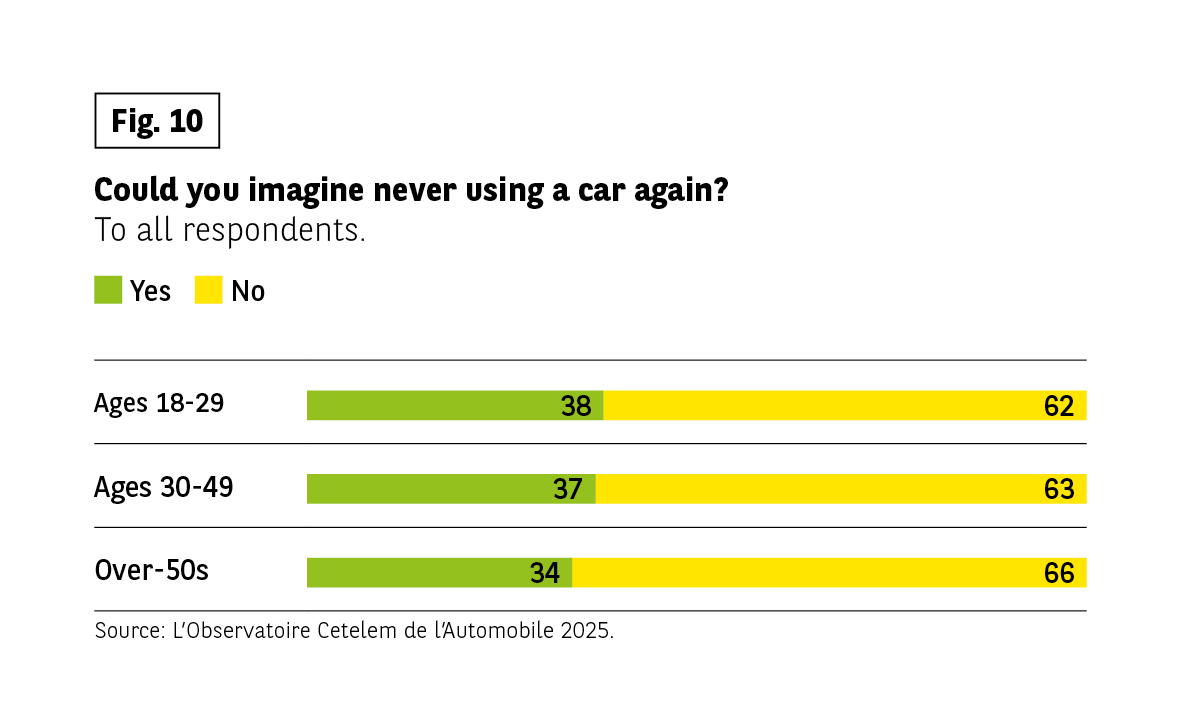 Graph indicating the proportion of people who can or cannot imagine living without a car, by age. The infographic presents the responses to the question “Could you imagine living your entire life without a car?”, asked to the entire sample. Two options are possible: “yes” and “no”. The results are compared for three age groups: 18-29 years old, 30-49 years old, and 50 years old and over. The data displayed are: 18-29 years old: yes 38%, no 62% 30-49 years old: yes 37%, no 63% 50 years old and over: yes 34%, no 66% Overall, a majority of respondents, regardless of age, declare that they cannot imagine living their entire life without a car. The proportions in favor of this idea decrease slightly with age. Source: Cetelem Automobile Observatory 2025