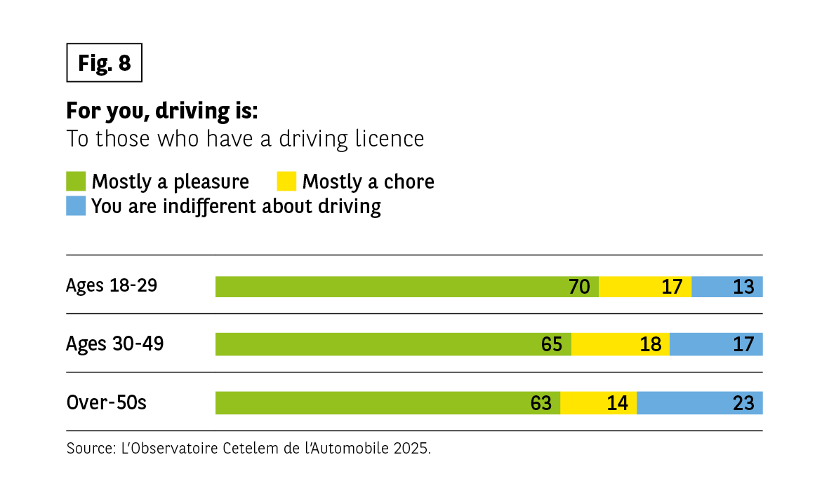 Comparison of how three age groups (18-29 years old, 30-49 years old, 50 years old and over) perceive driving (pleasure, chore, indifferent). The infographic presents the responses to the question “For you, driving is…”, asked to people who have a driver’s license. Three options are proposed: “most of the time a pleasure”, “most of the time a chore”, and “it leaves me indifferent”. The results are compared for three age groups: 18-29 years old, 30-49 years old, and 50 years old and over. The data indicated are: 18-29 years old: pleasure 70%, chore 17%, indifferent 13% 30-49 years old: pleasure 65%, chore 18%, indifferent 17% 50 years old and over: pleasure 63%, chore 14%, indifferent 23% Overall, driving is mostly experienced as a pleasure in all age groups, with a slight decrease among older respondents. The perception of a chore remains minority, while indifference tends to increase progressively with age. Source: Cetelem Automobile Observatory 2025