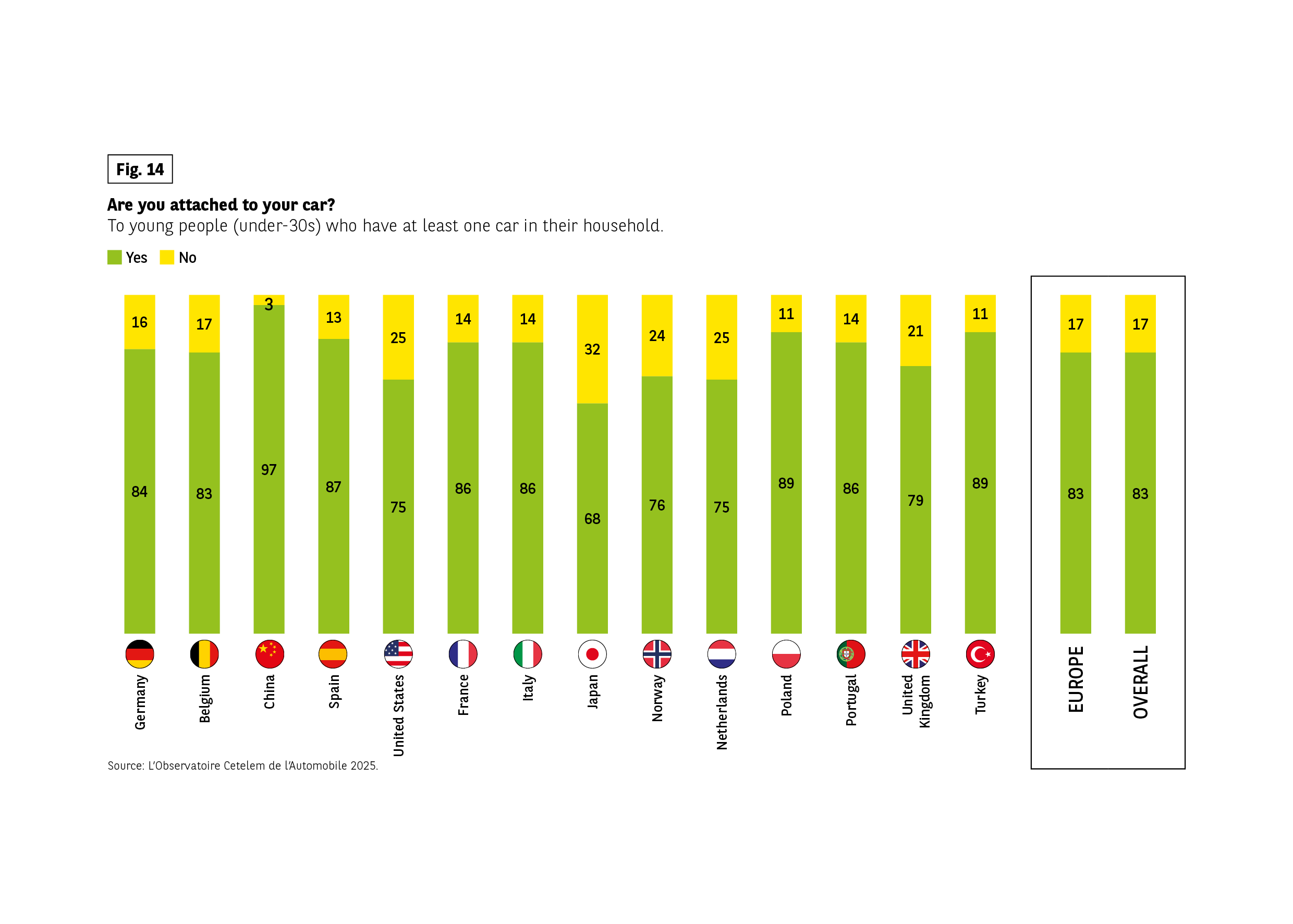 Overall, the vast majority of young people surveyed declare that they are attached to their car, with particularly high levels in several European countries and in China. Japan has the lowest attachment level in the panel, while other countries range between 75% and nearly 90%.