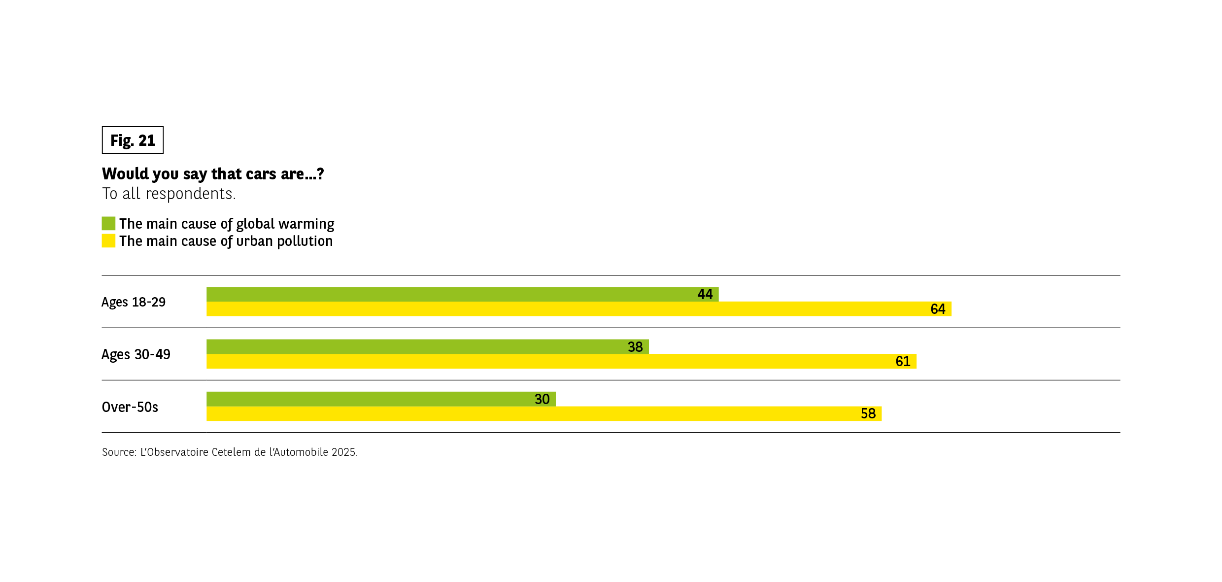 Overall, all three age groups associate the car more with urban pollution than with climate change, with a slightly decreasing intensity according to age. Younger people are also more likely to consider the car a significant source of climate change.
