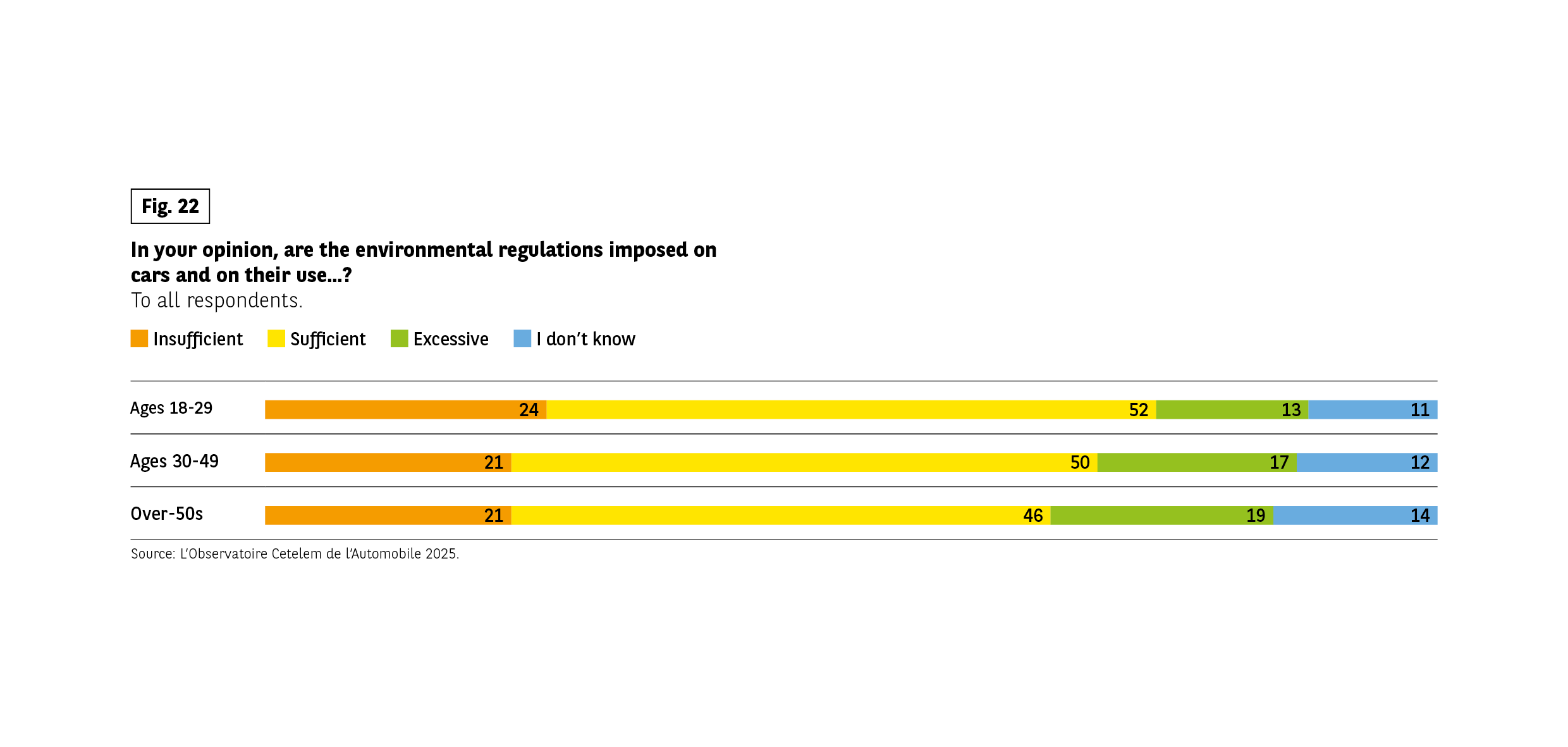 Young people are also slightly stricter when it comes to the environmental regulations imposed on cars. However, only 24% believe them to be inadequate, with just 21% of seniors agreeing. 1 in 2 are of the view that current regulations are sufficient. As one might expect, criticism is more likely to be encountered in cities. Once again, the environmental “literacy” of young people, which is founded on higher-quality information, may account for this result (Fig. 22).