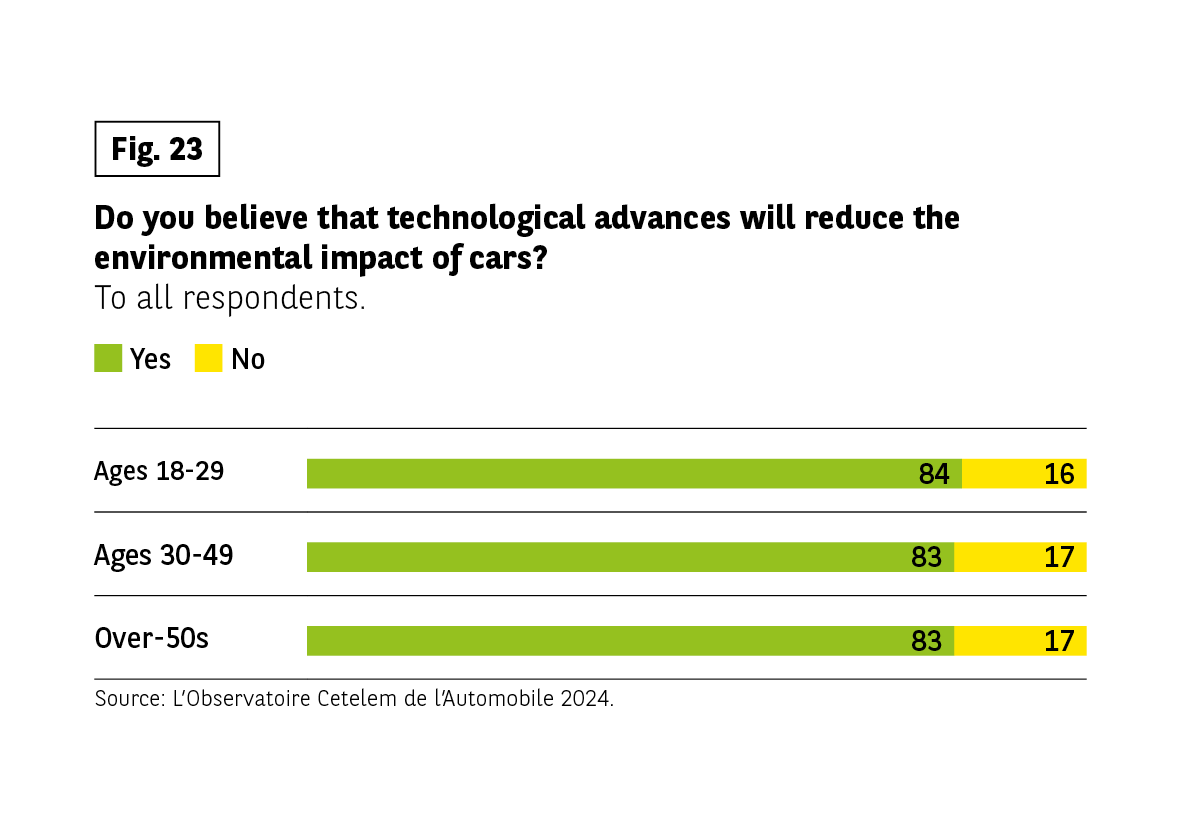 Some of the results from last year’s Observatoire Cetelem shed further light on the topic. What they highlight, for instance, is that 84% of young people believe that technological advances will improve the environmental performance of cars. This opinion is held by all generations (Fig. 23).